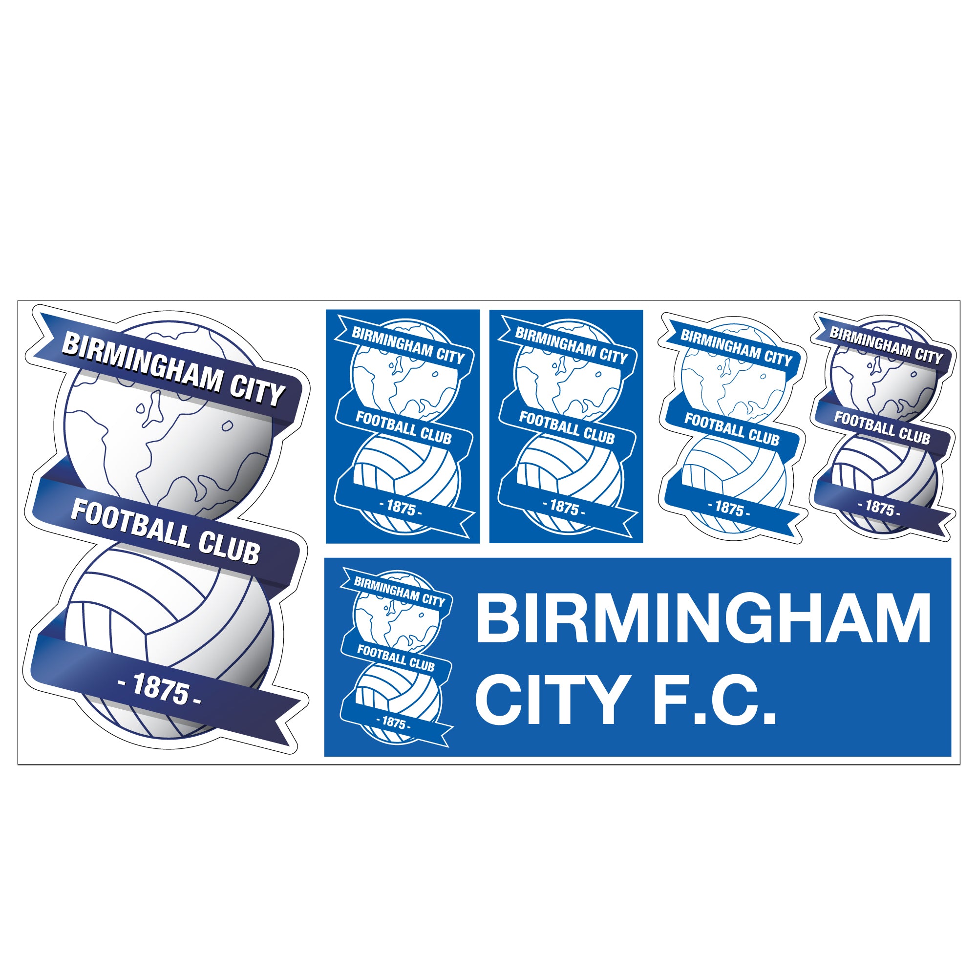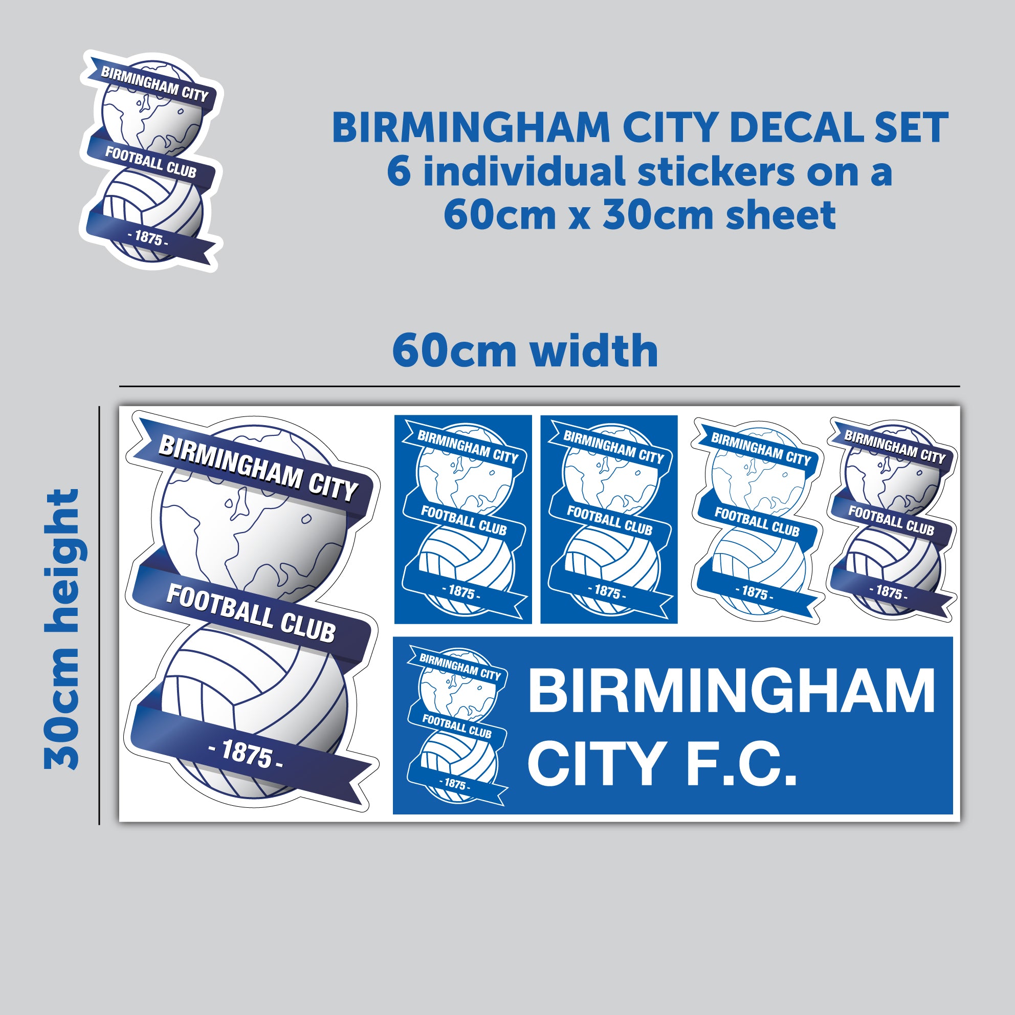Contents: x1 Official Birmingham Football Club Decal Sticker Set. Includes 6 individual stickers on a 60cm x 30cm sheet.
