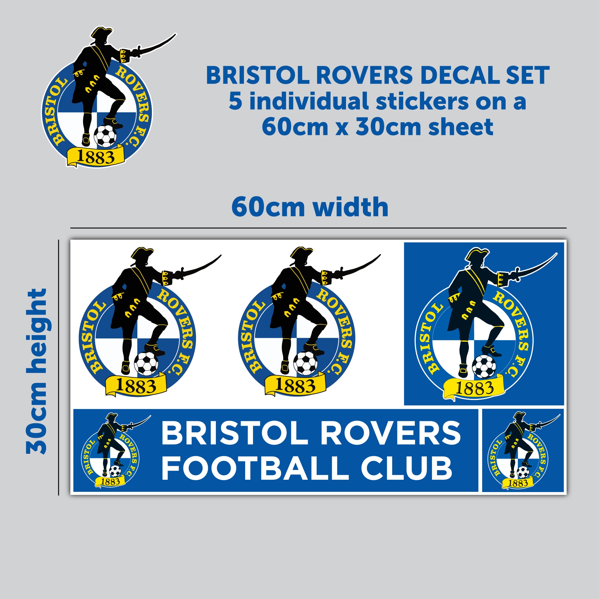 Contents: x1 Official Bristol Rovers Football Club Decal Sticker Set. Includes 5 individual stickers on a 60cm x 30cm sheet.