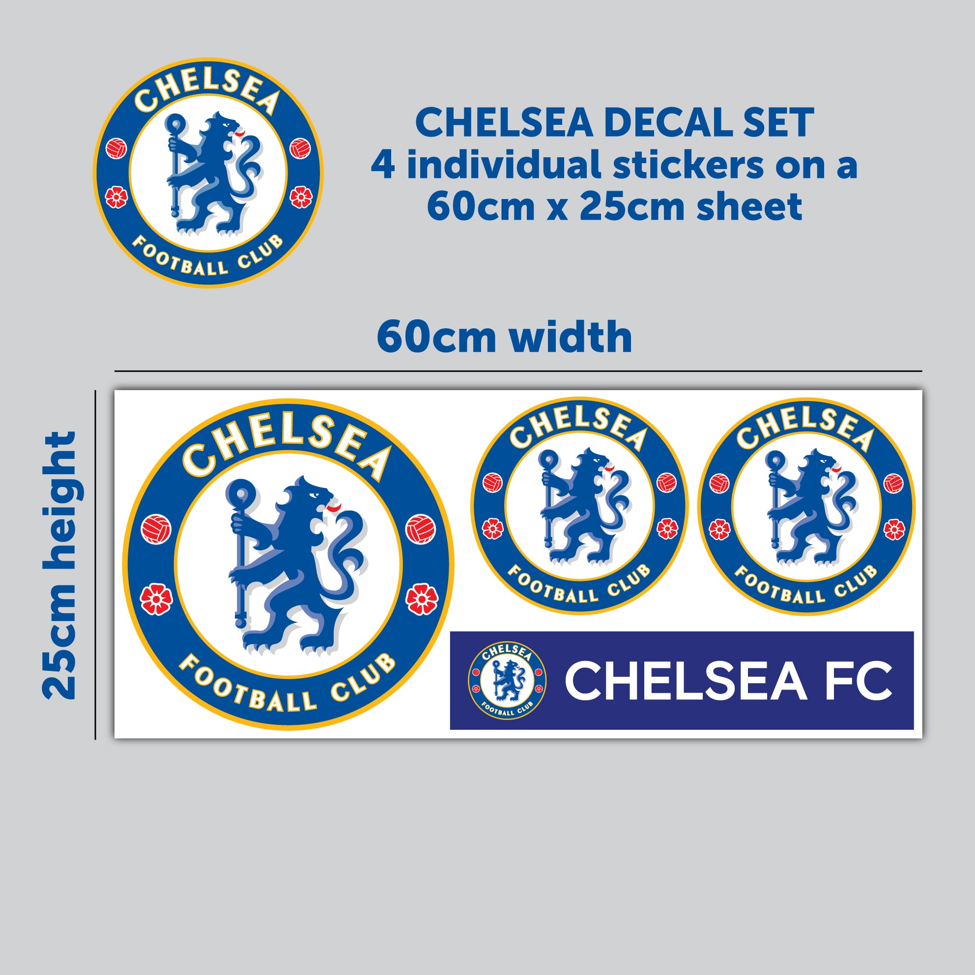 Contents: x1 Official Chelsea Football Club Decal Sticker Set. Includes 4 individual stickers on a 60cm x 25cm sheet.