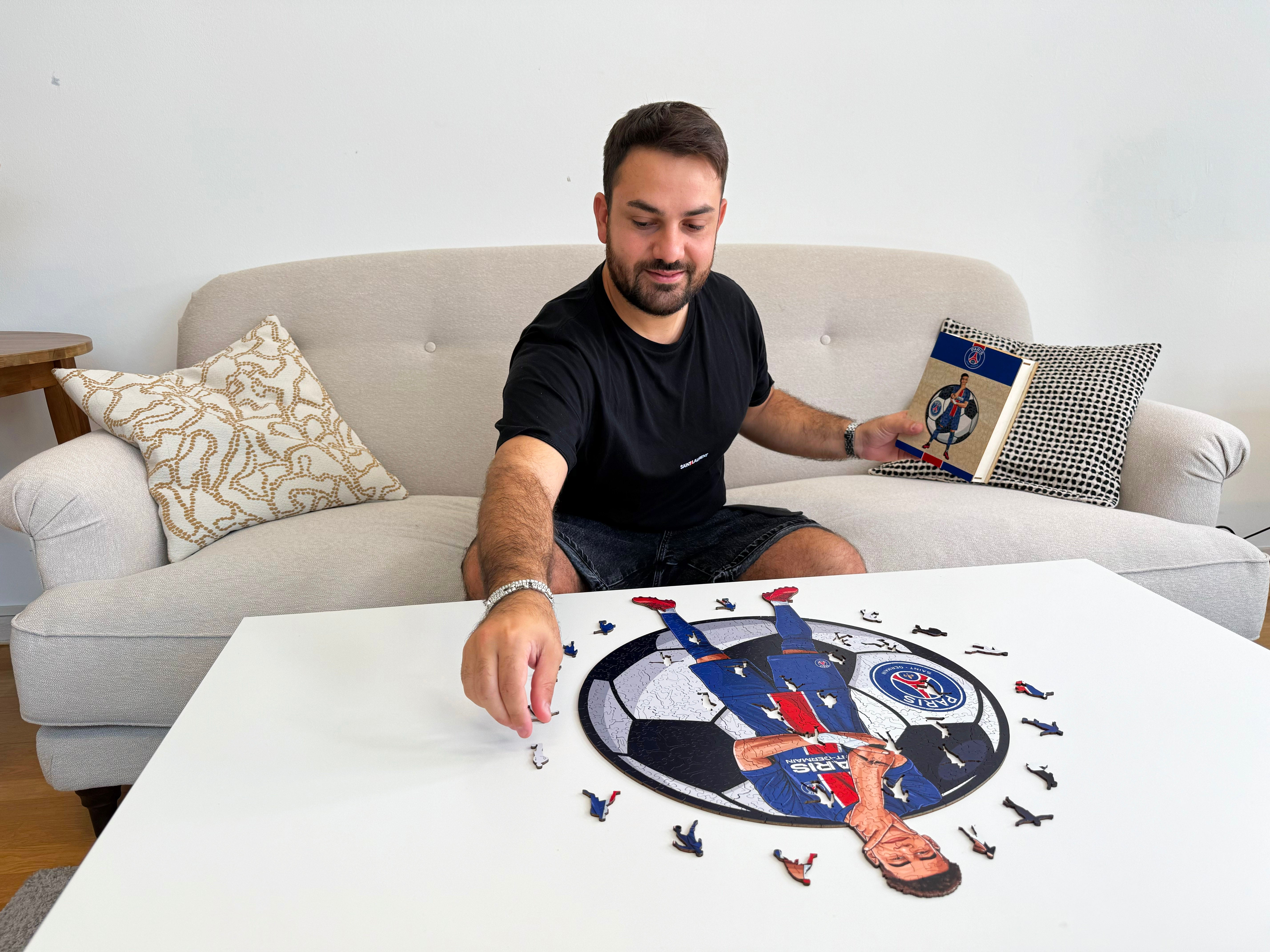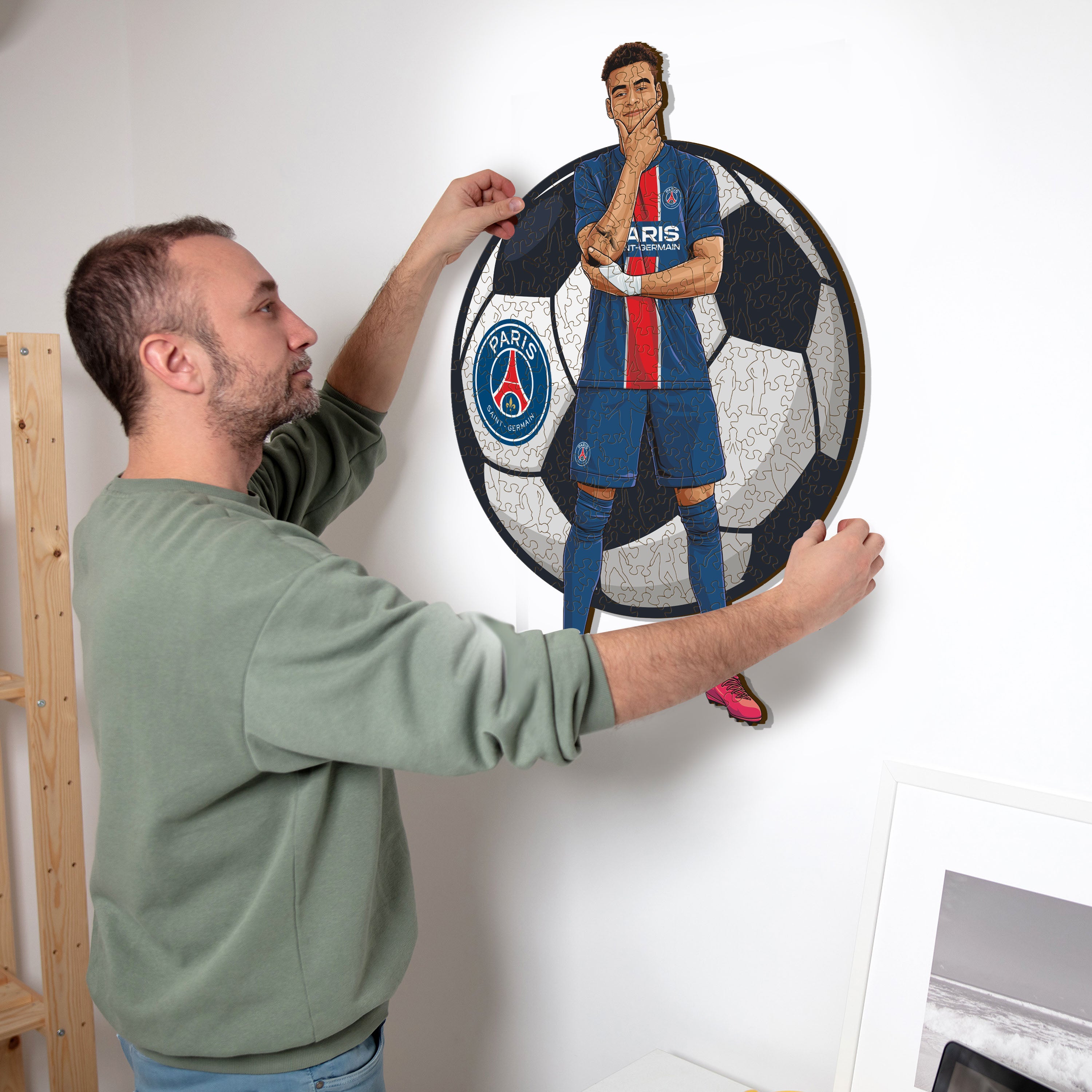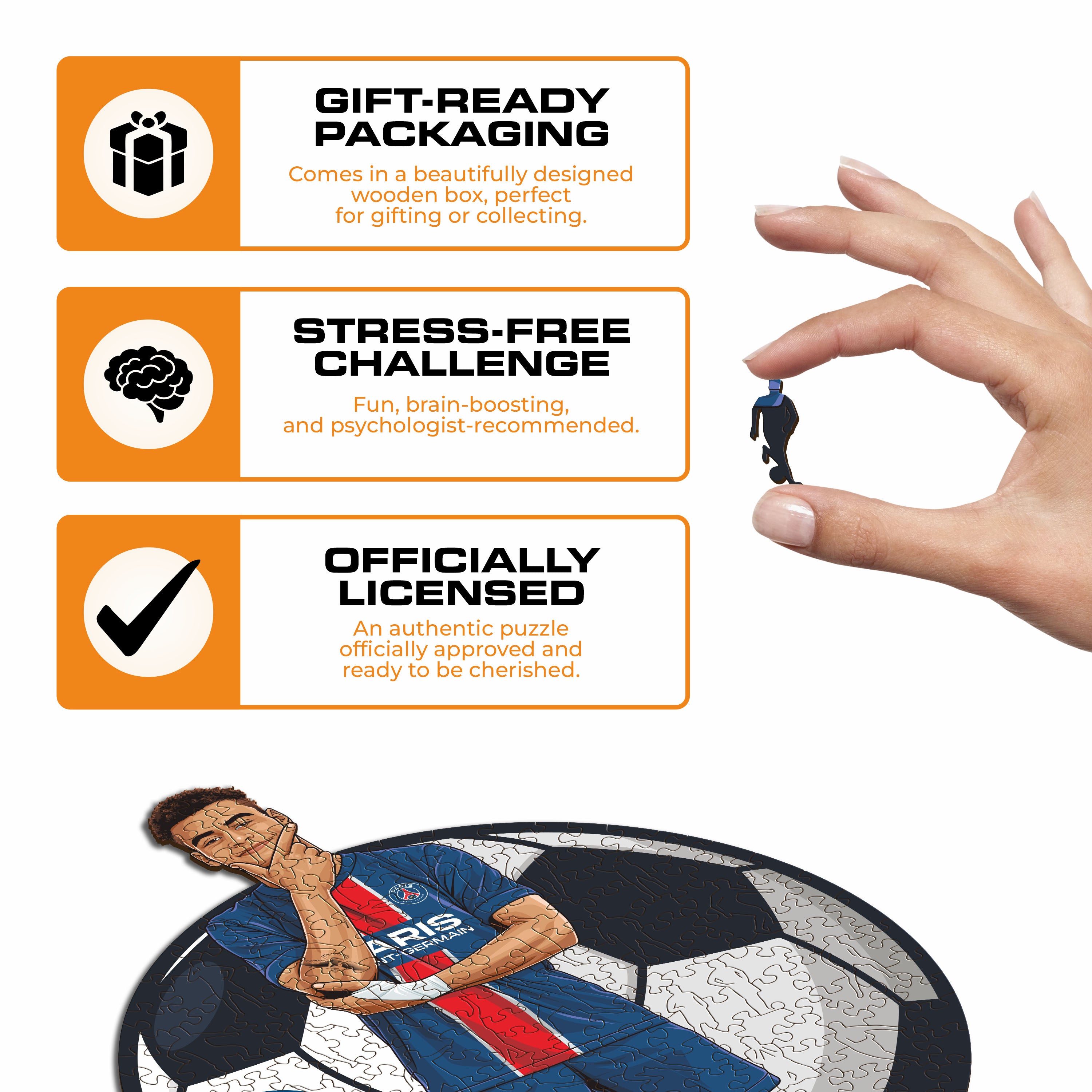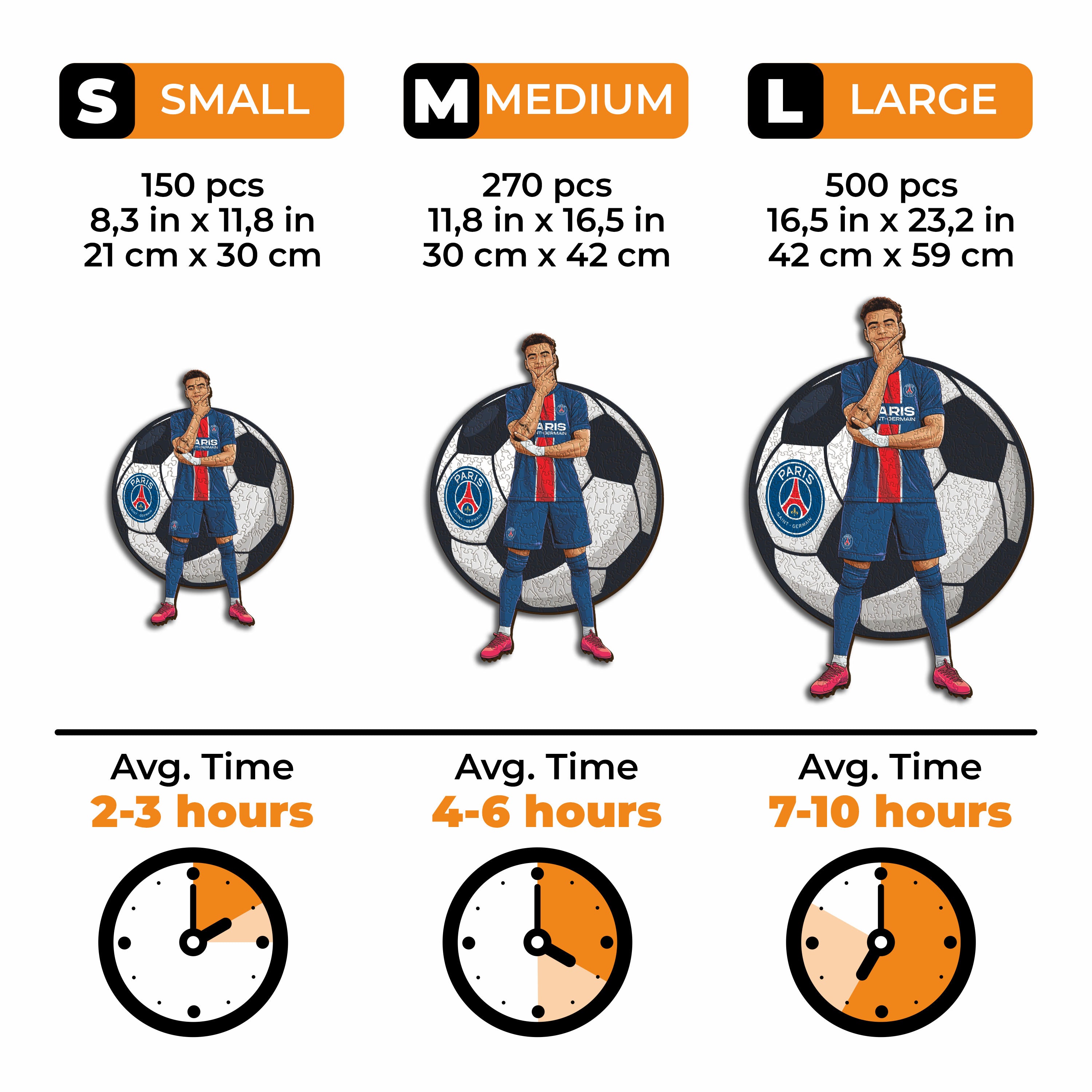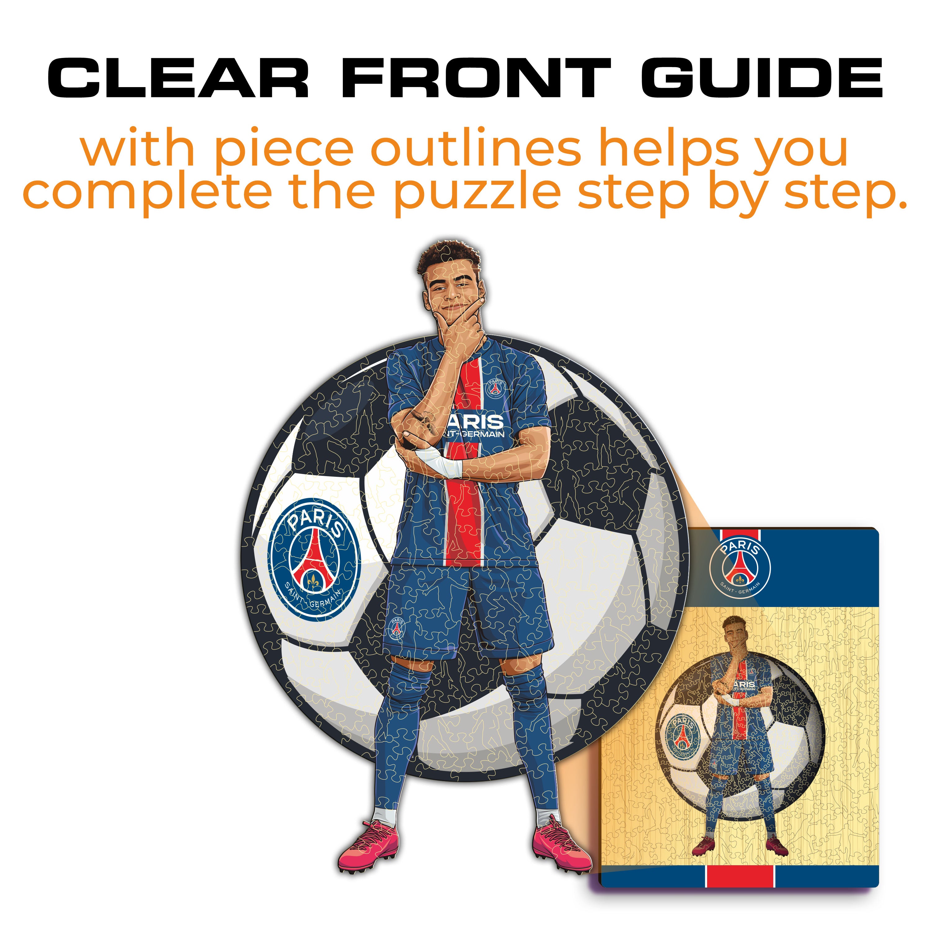 ✓ Each puzzle piece has a unique shape that depicts elements related to soccer and iconic player poses.