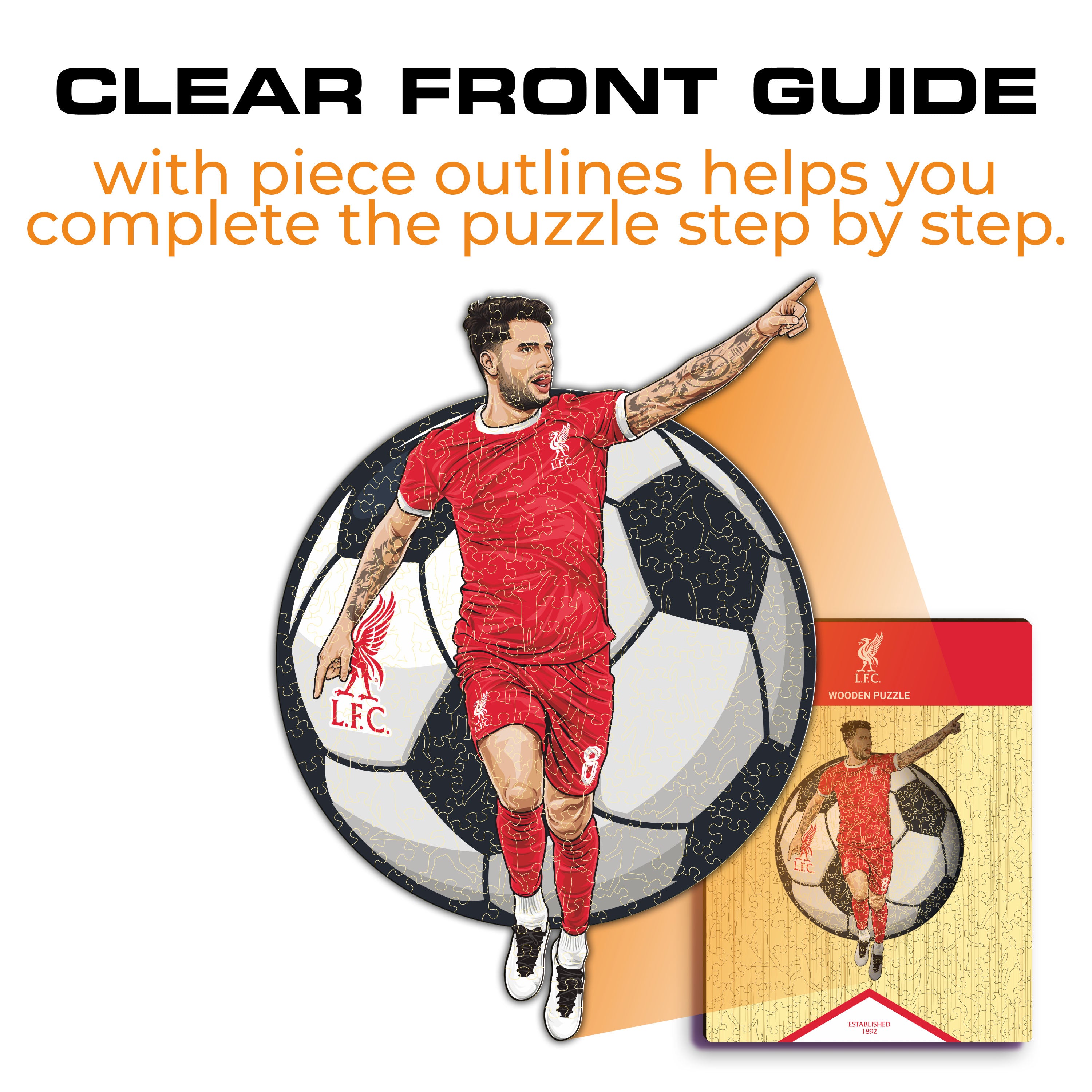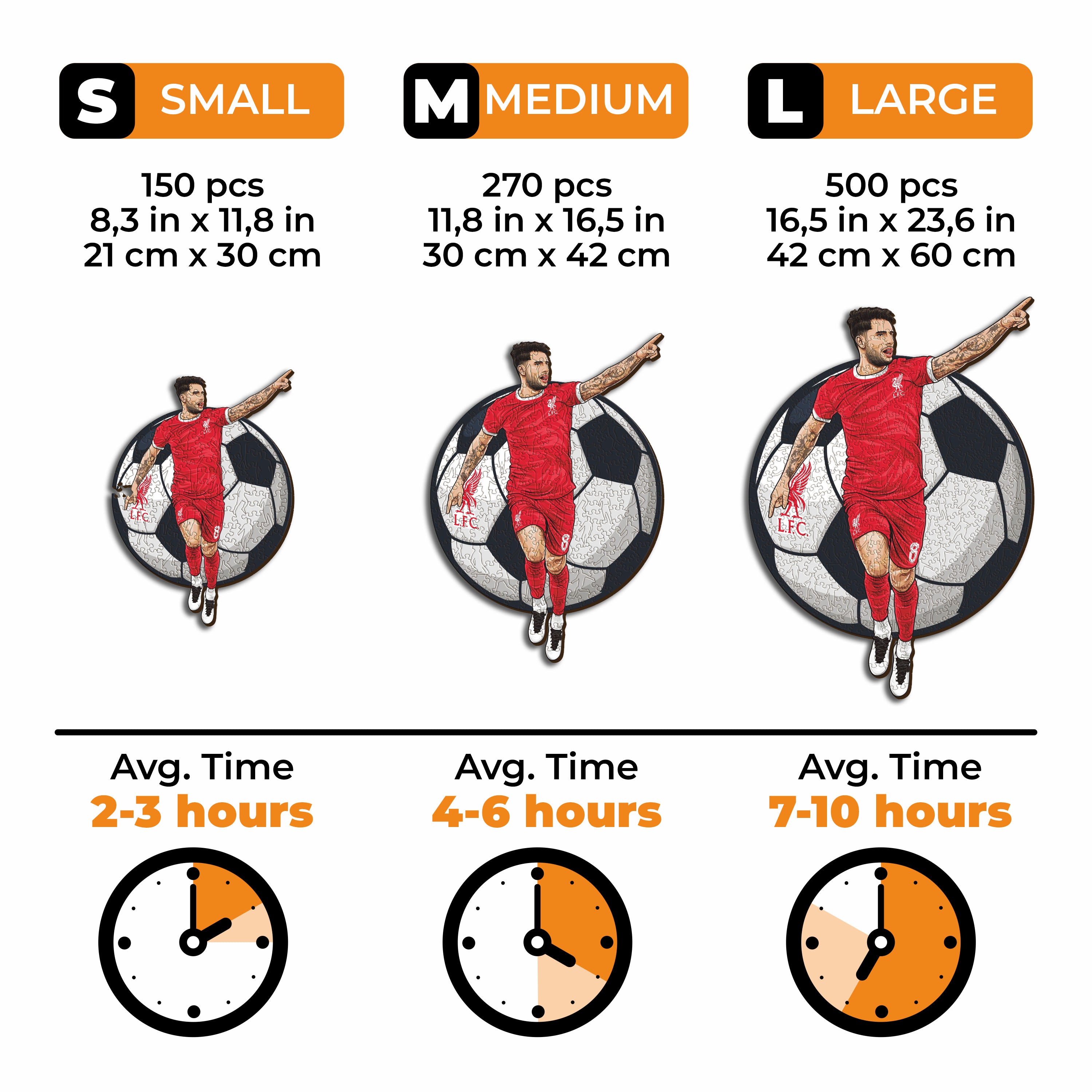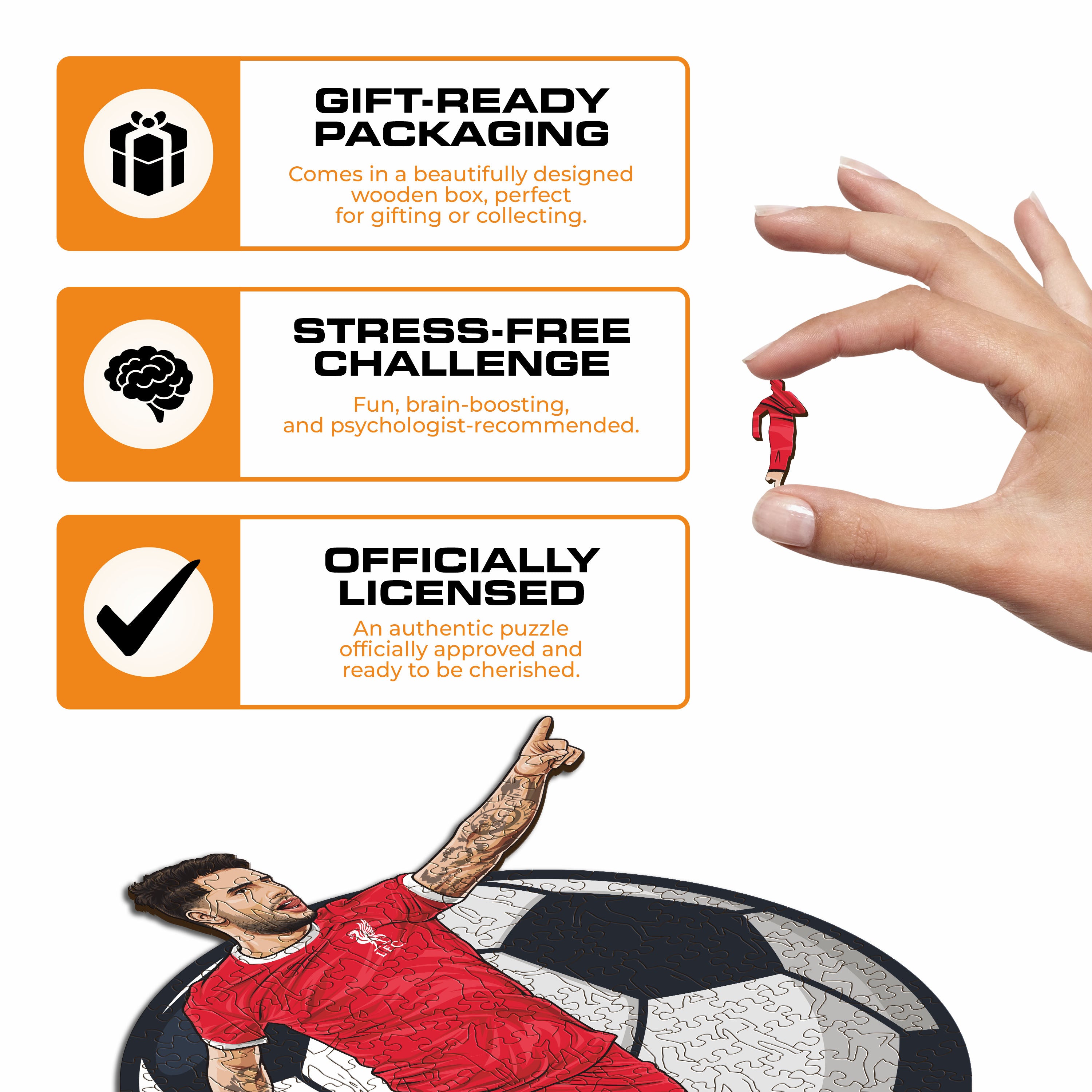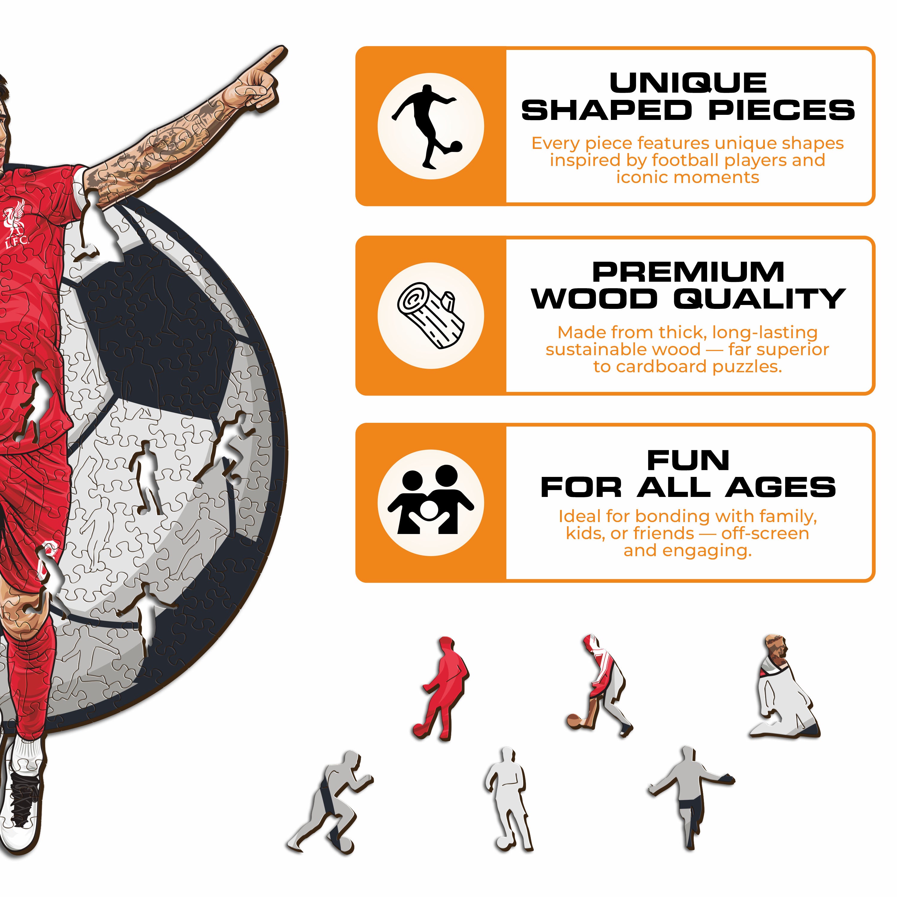 ✓ Each puzzle piece has a unique shape that depicts elements related to soccer and iconic players' poses.