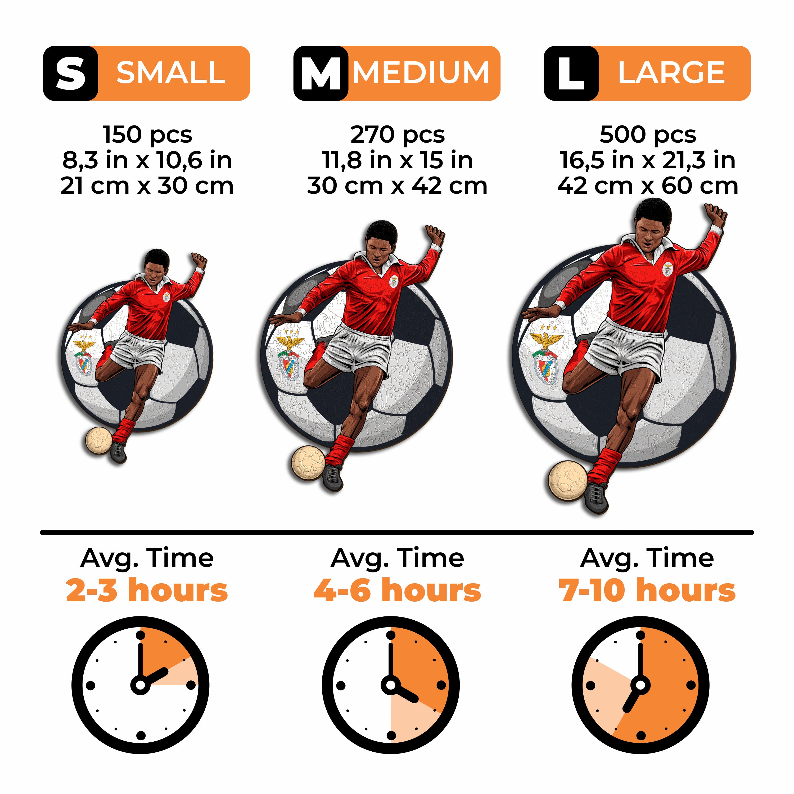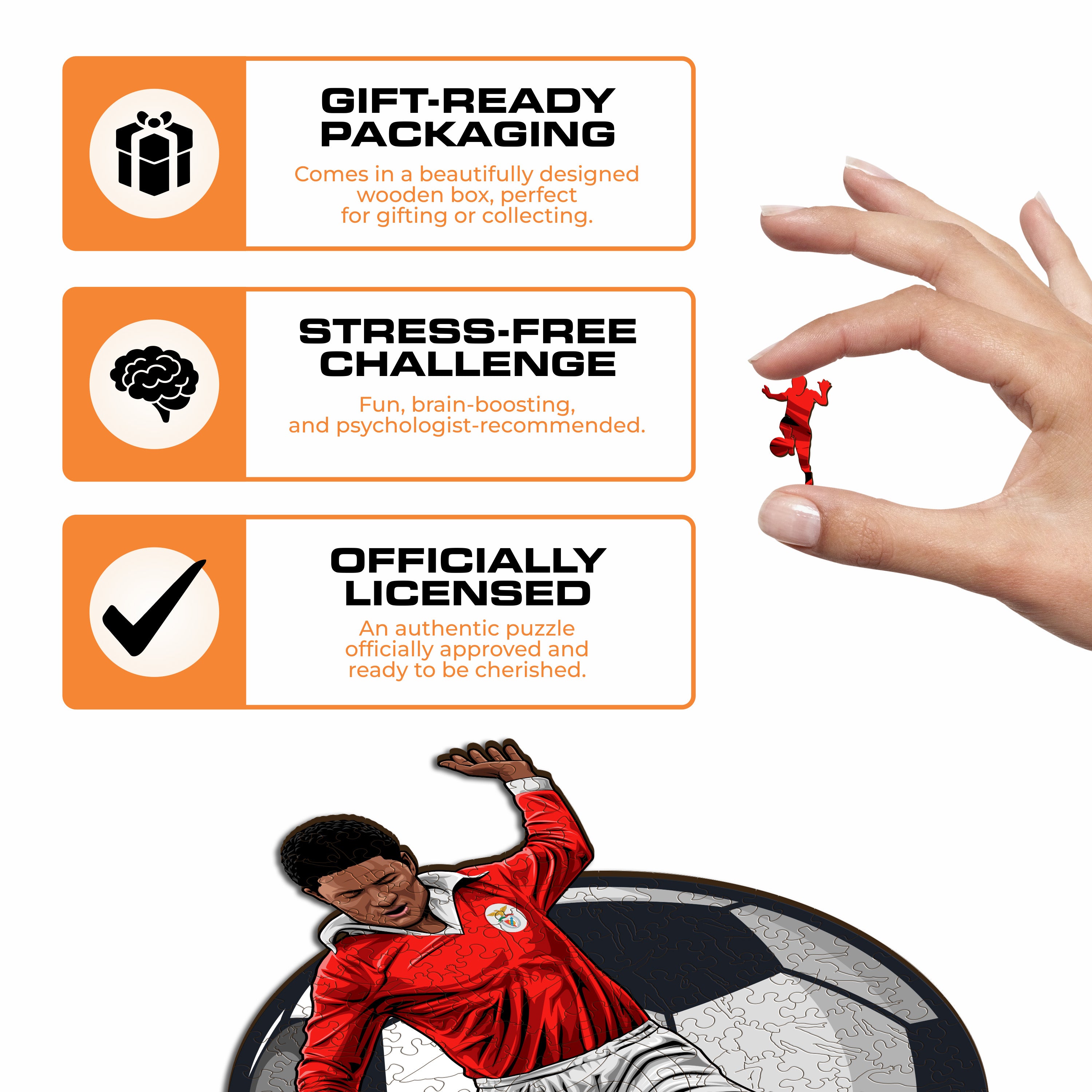✓ Each puzzle piece has a unique shape that depicts elements related to soccer and iconic player poses.