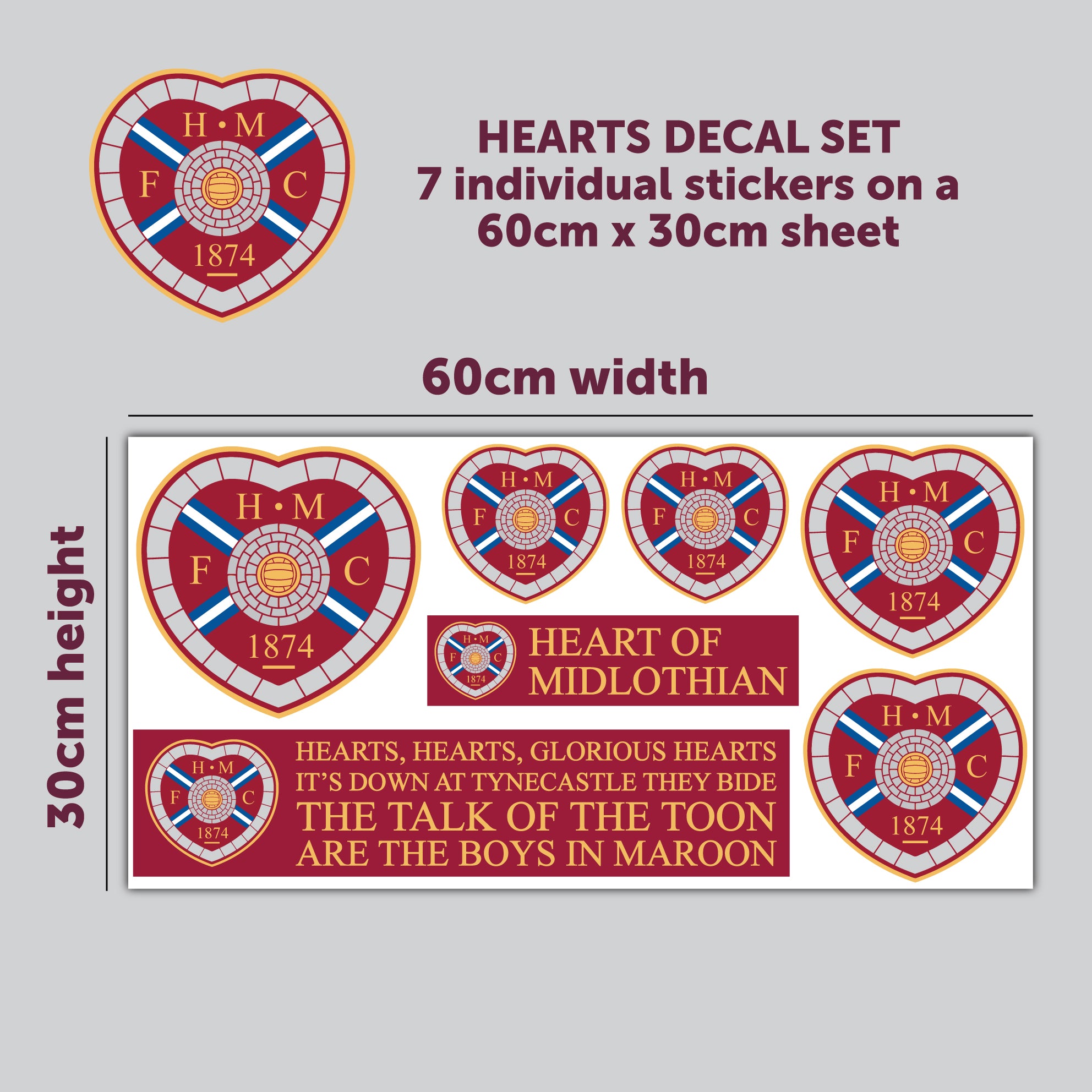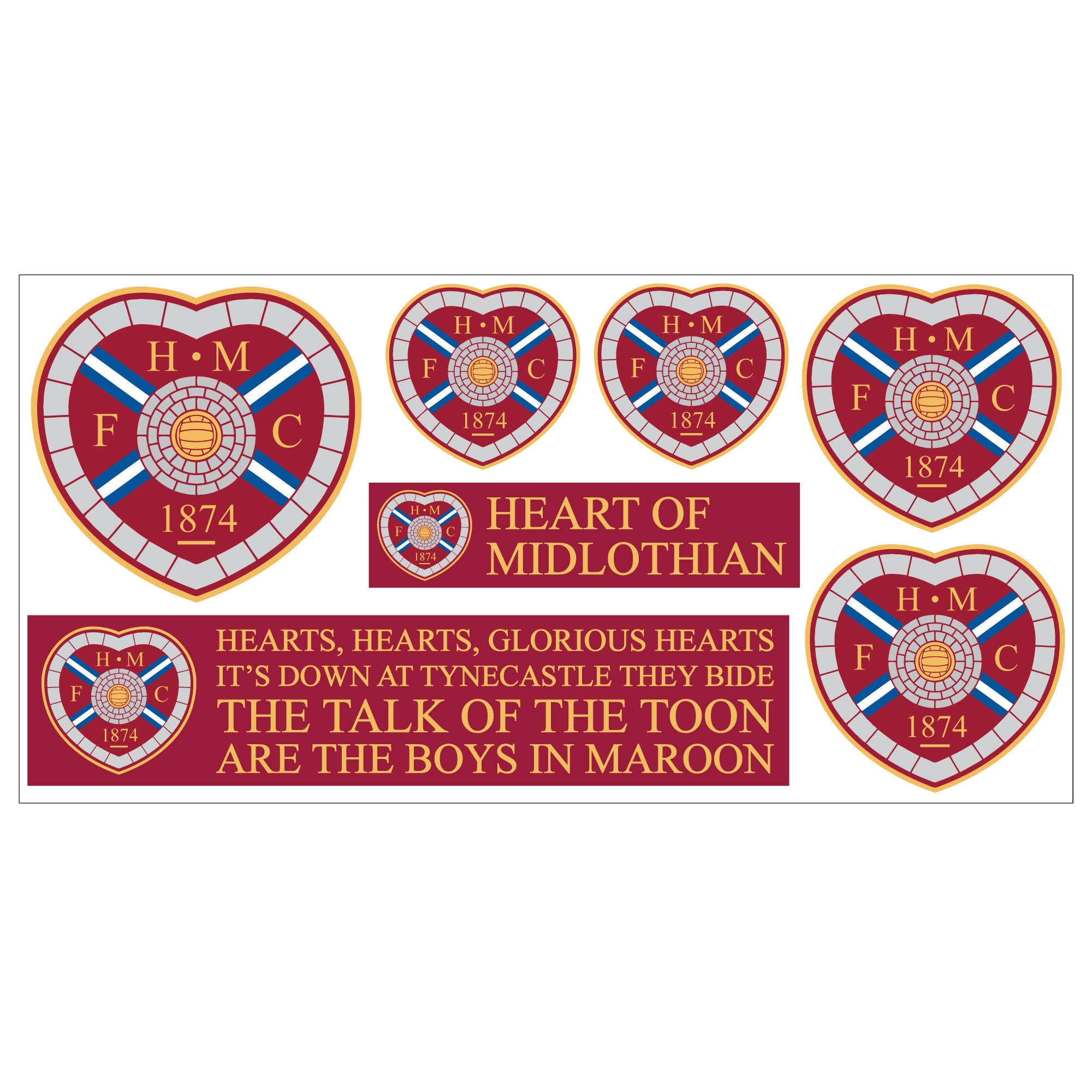 Contents: x1 Official Heart of Midlothian Football Club Decal Sticker Set. Includes 7 individual stickers on a 60cm x 30cm sheet.