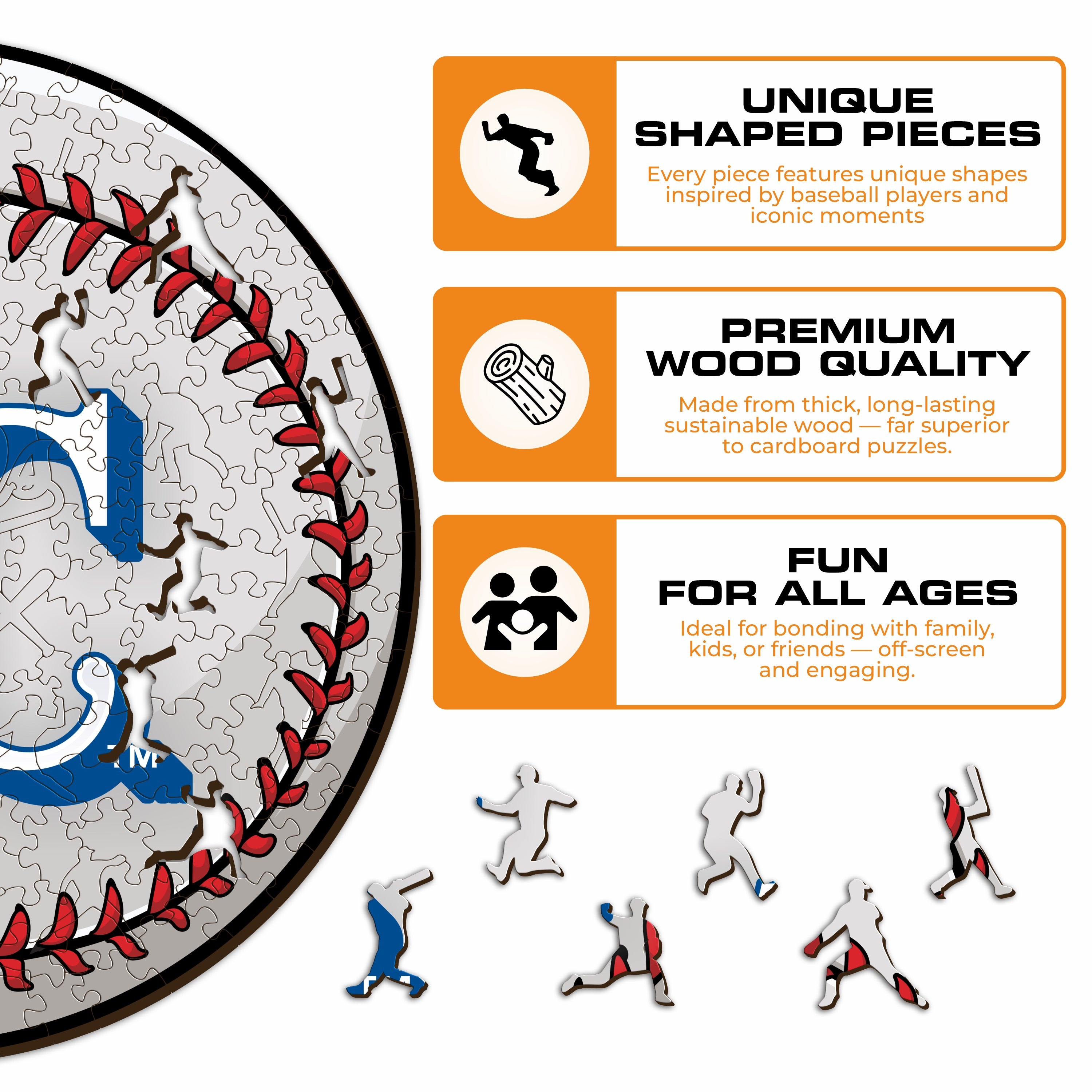 ✓ Each puzzle piece has a unique shape that depicts elements related to baseball and iconic player poses.