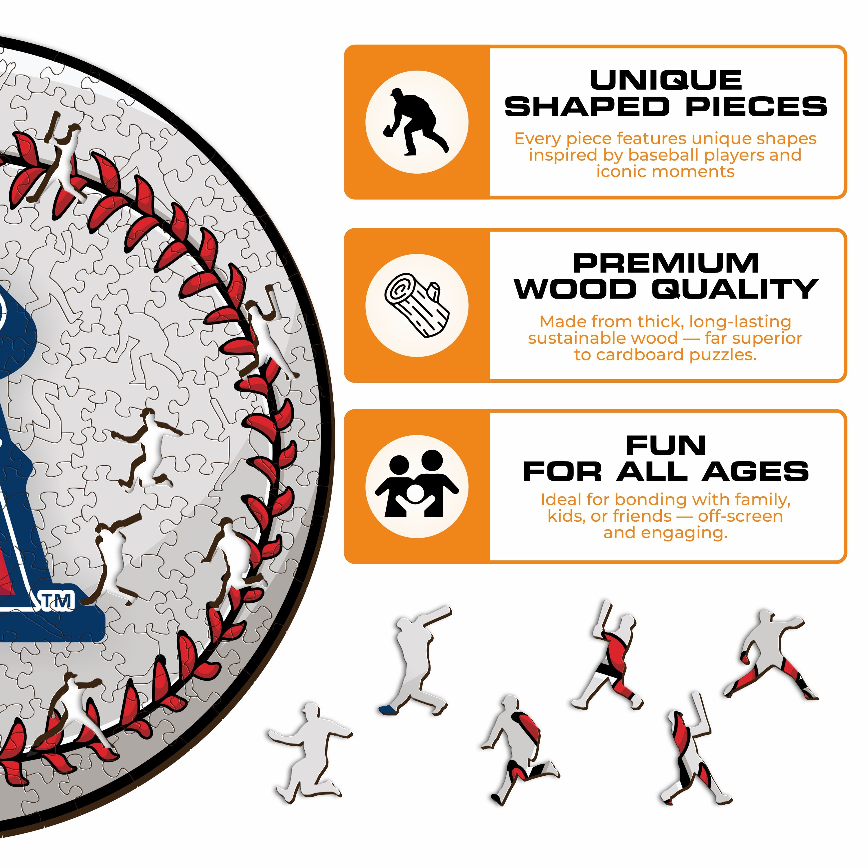 ✓ Each puzzle piece has a unique shape that depicts elements related to baseball and iconic player poses.