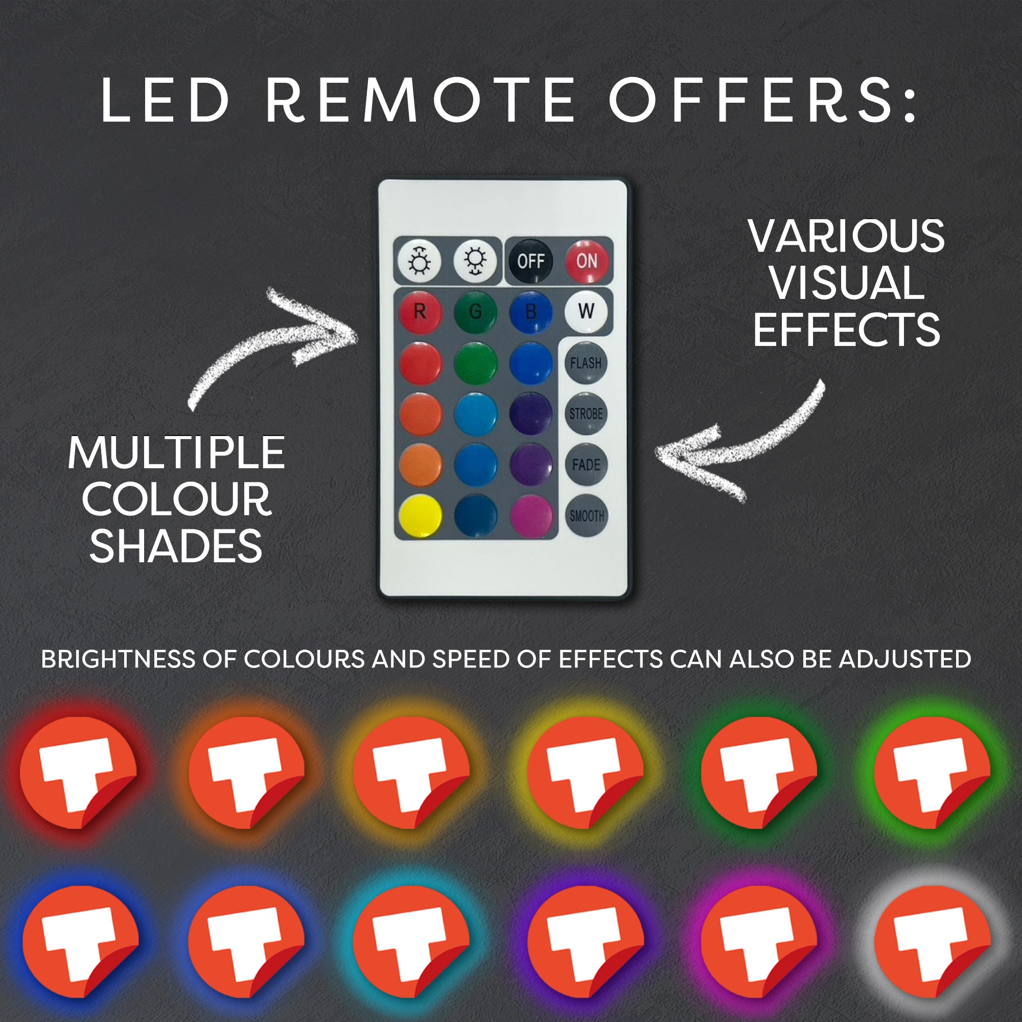 The included remote control lets you easily adjust the LED colour with 16 shades and numerous visual effects. including dynamic options like strobe and smooth transitions.