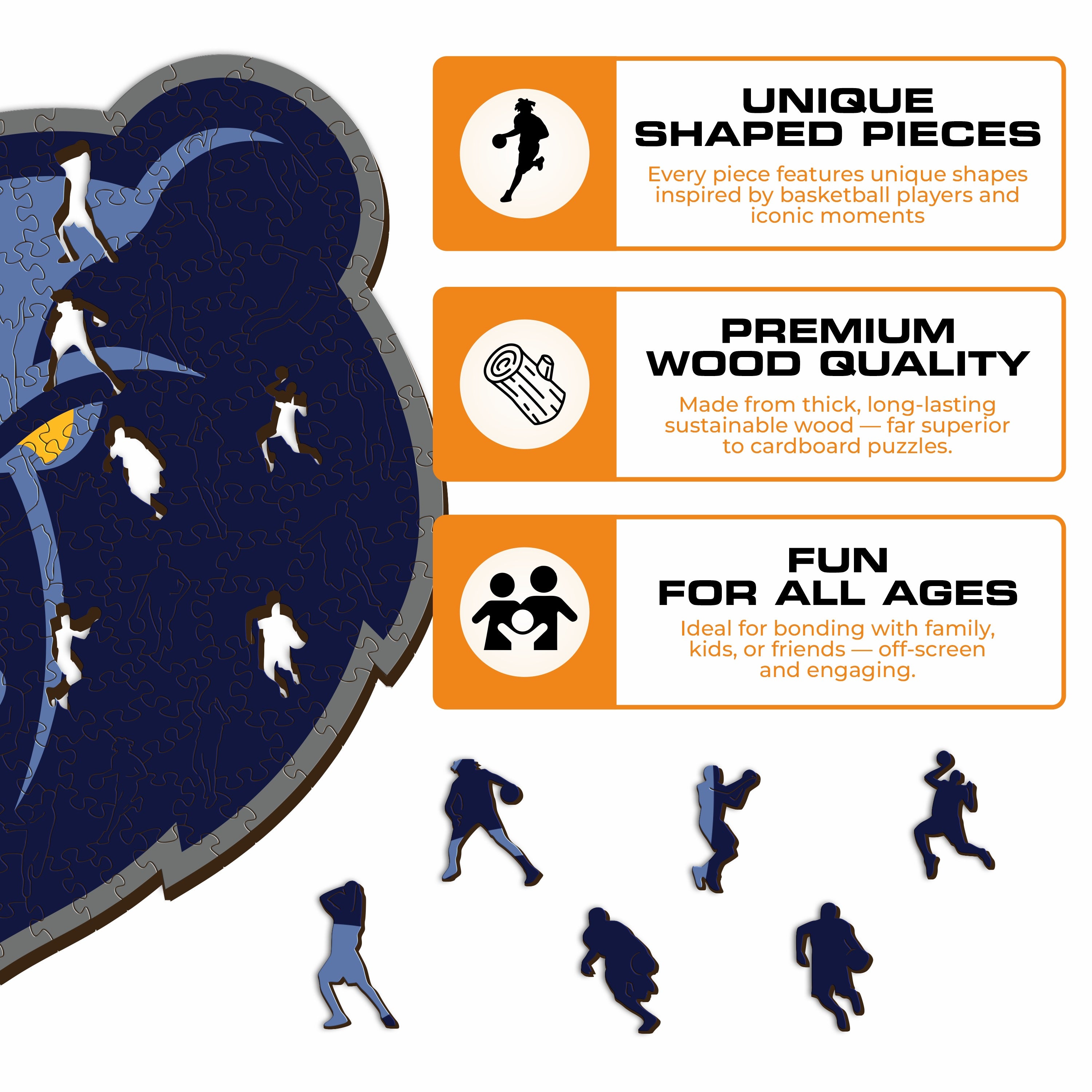 ✓ Each puzzle piece has a unique shape that depicts elements related to basketball and iconic player poses.