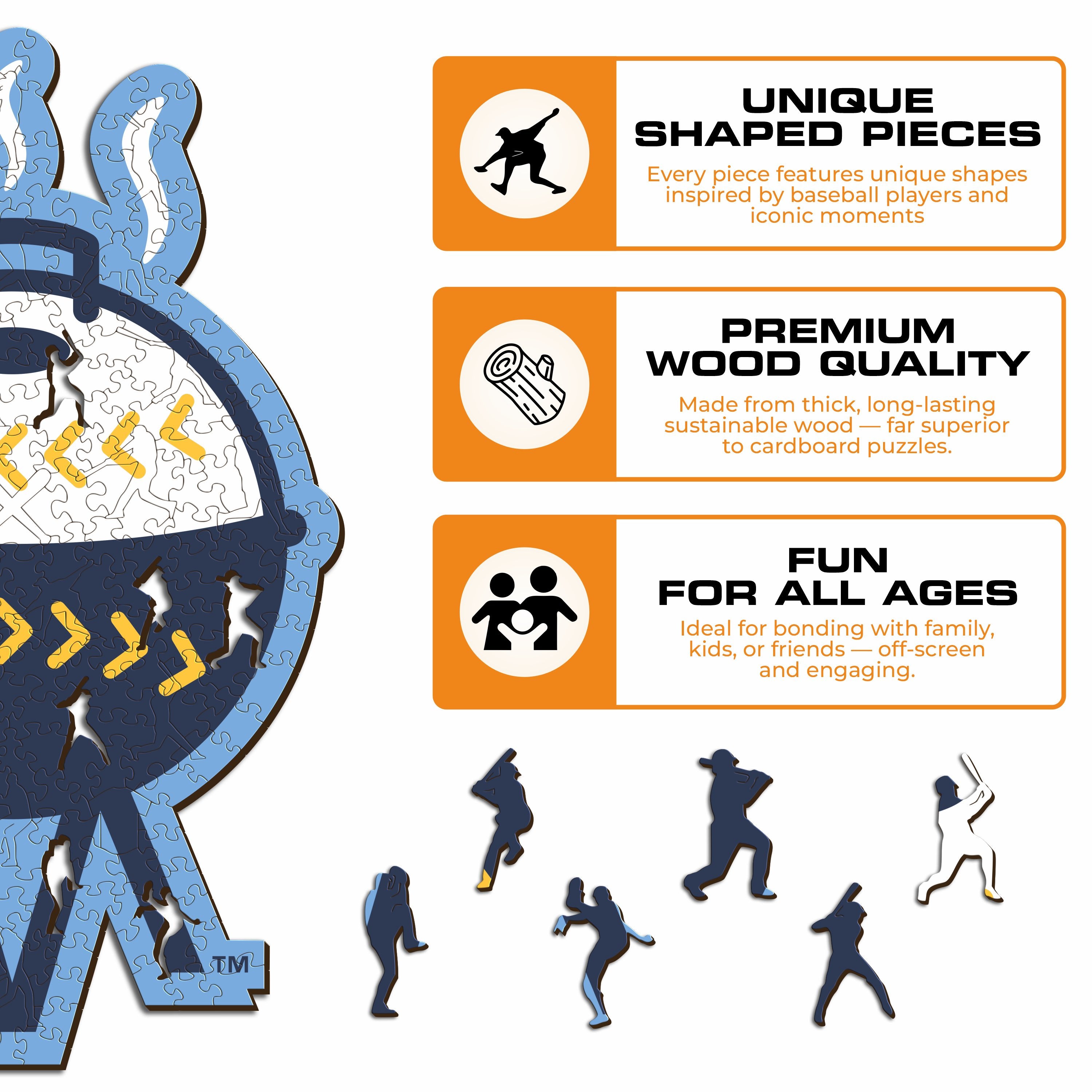 ✓ Each puzzle piece has a unique shape that depicts elements related to baseball and iconic player poses.