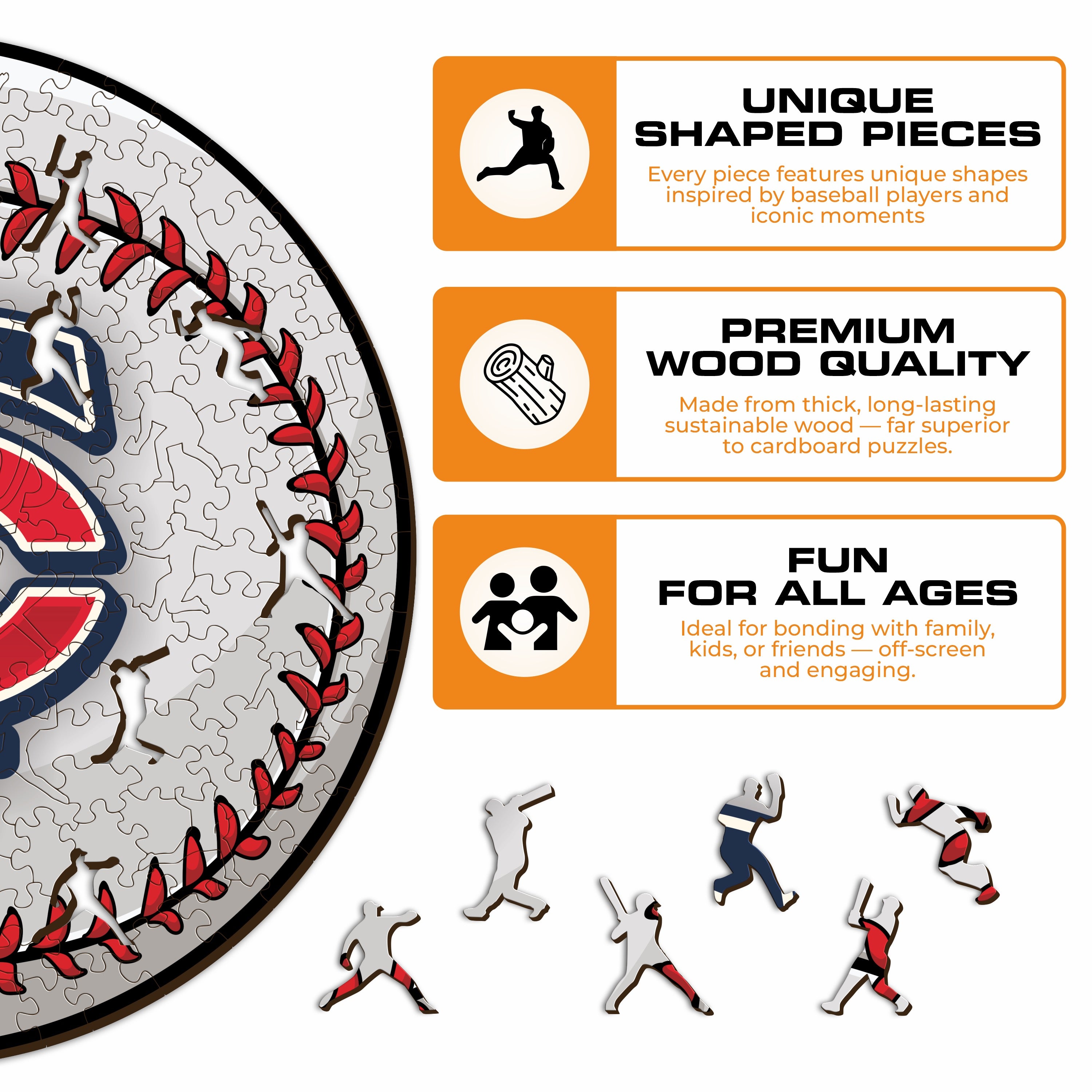 ✓ Each puzzle piece has a unique shape that depicts elements related to baseball and iconic player poses.