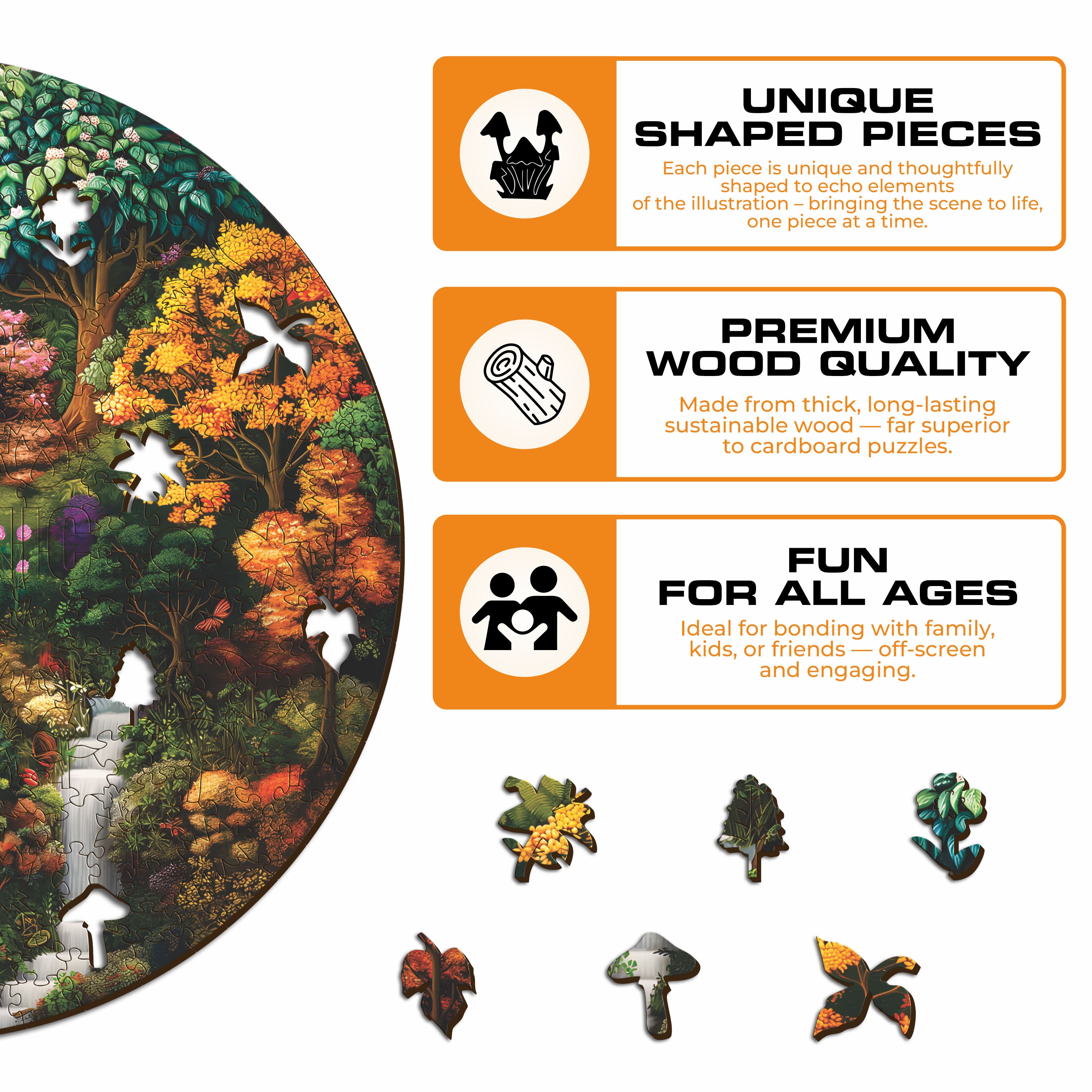 ✓ Each puzzle piece has a unique shape that depicts elements related to the nature.