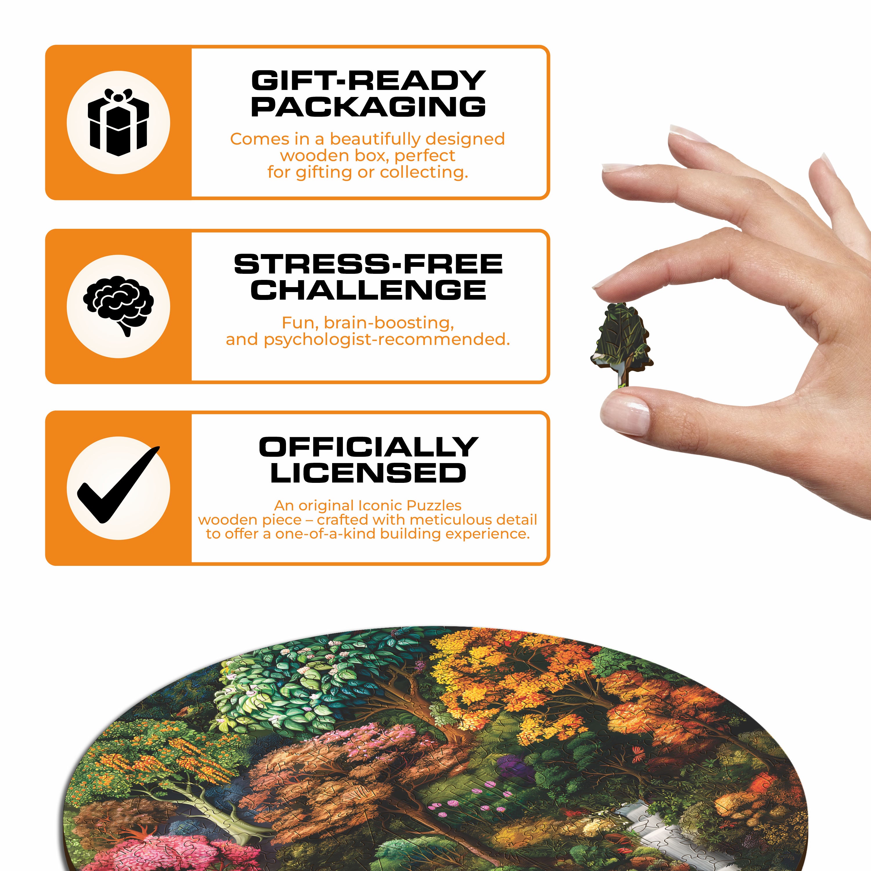 - 100% sustainable wooden puzzle 1/5in (0.3cm) thick.