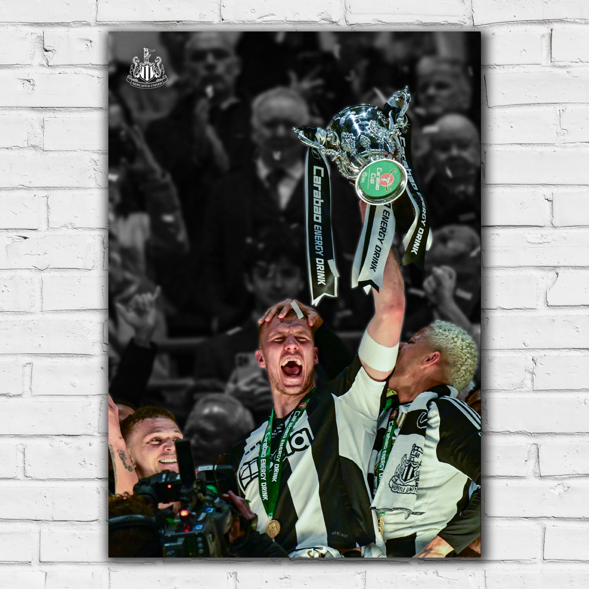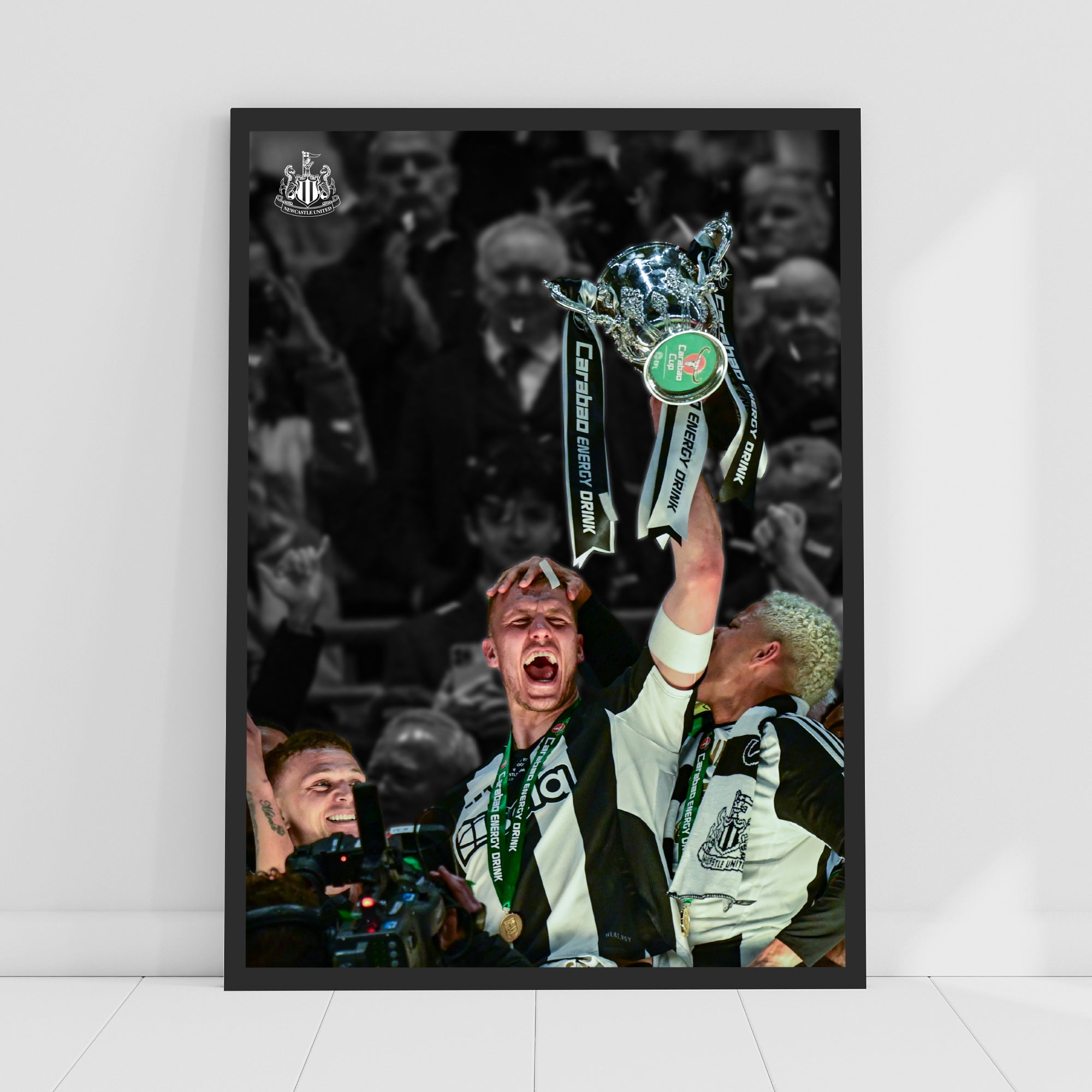 Contents: x1 Newcastle United FC Cup Winners Dan Burn Trophy Lift Portrait Print (in your chosen size and frame option).