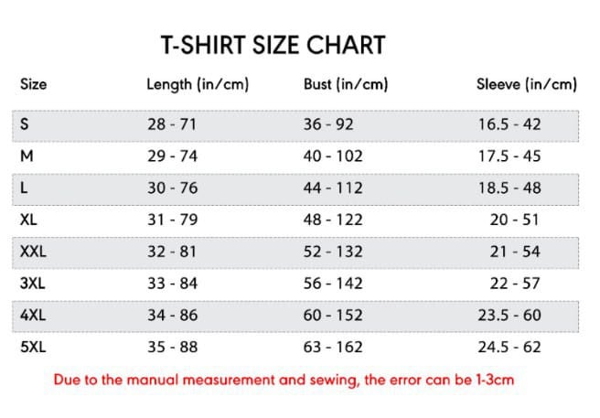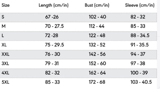 • Size chart for Hoodie, Zip Hoodie, Sweatshirt