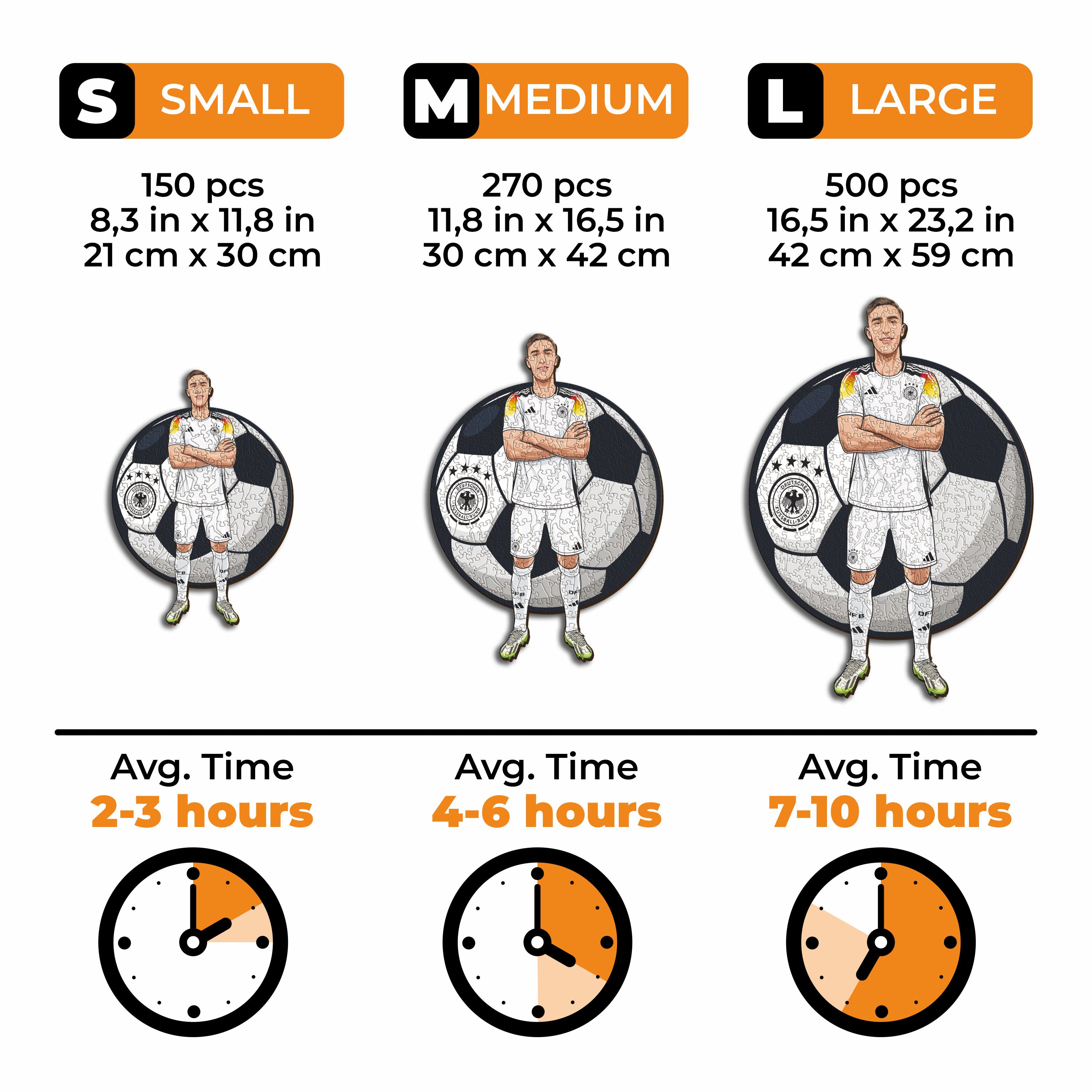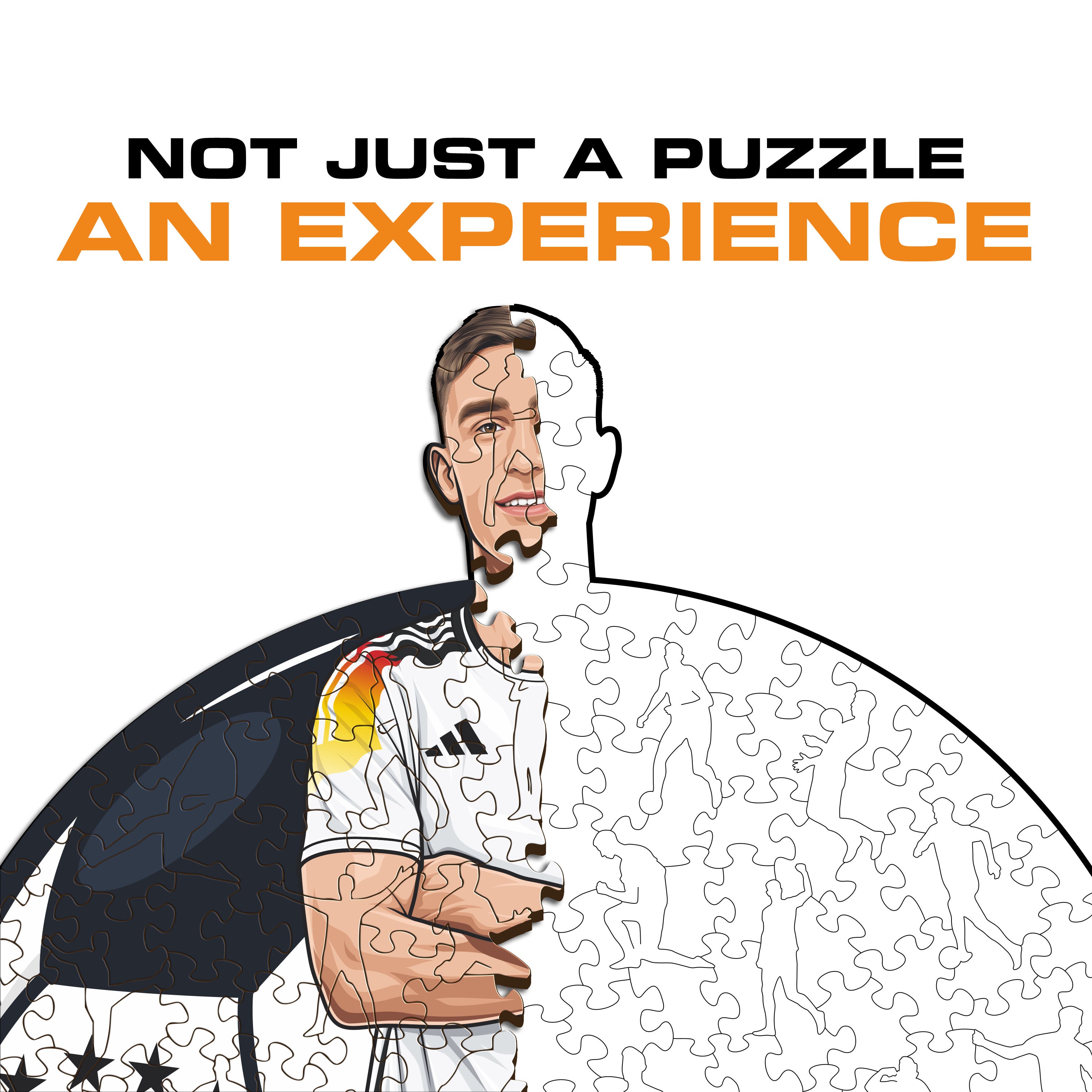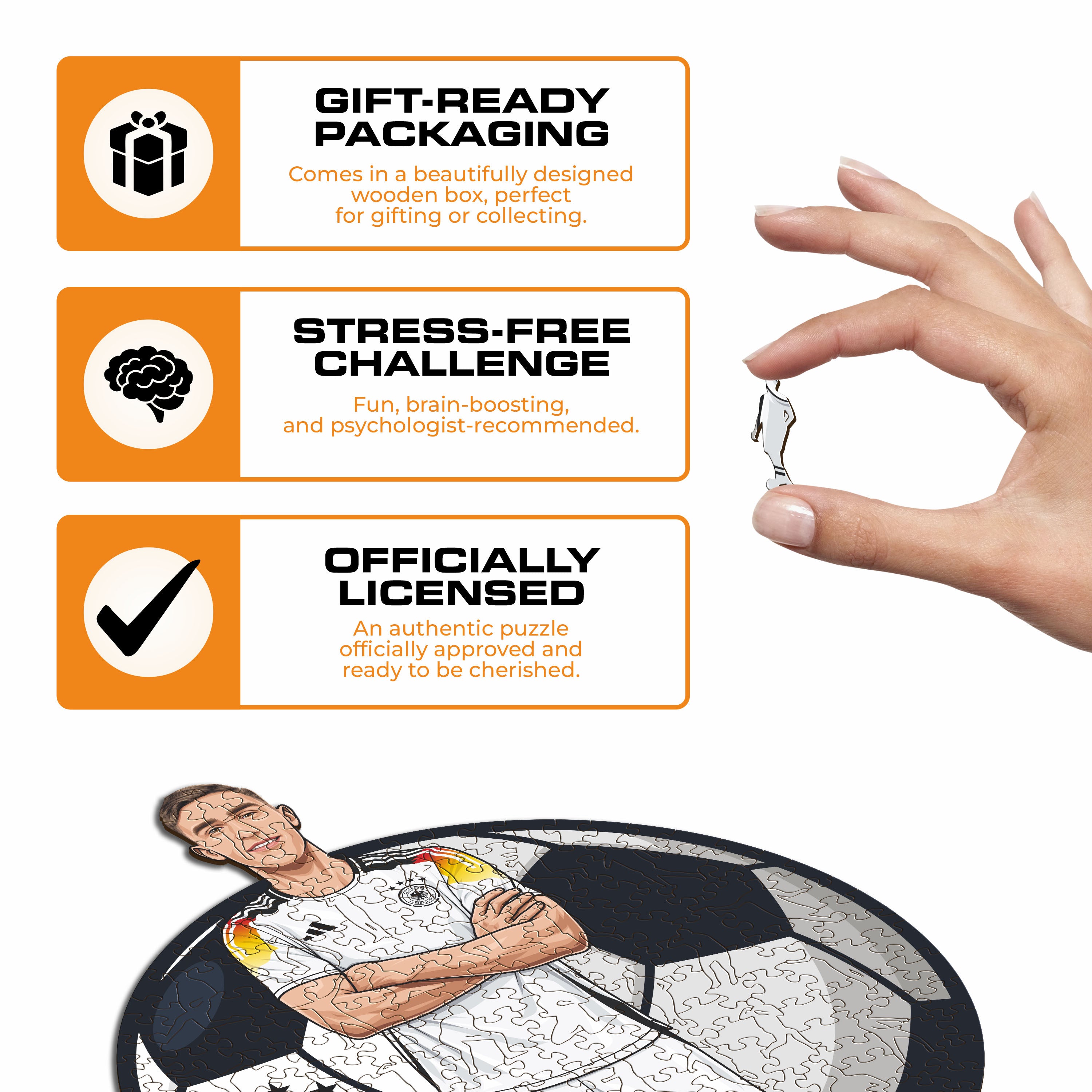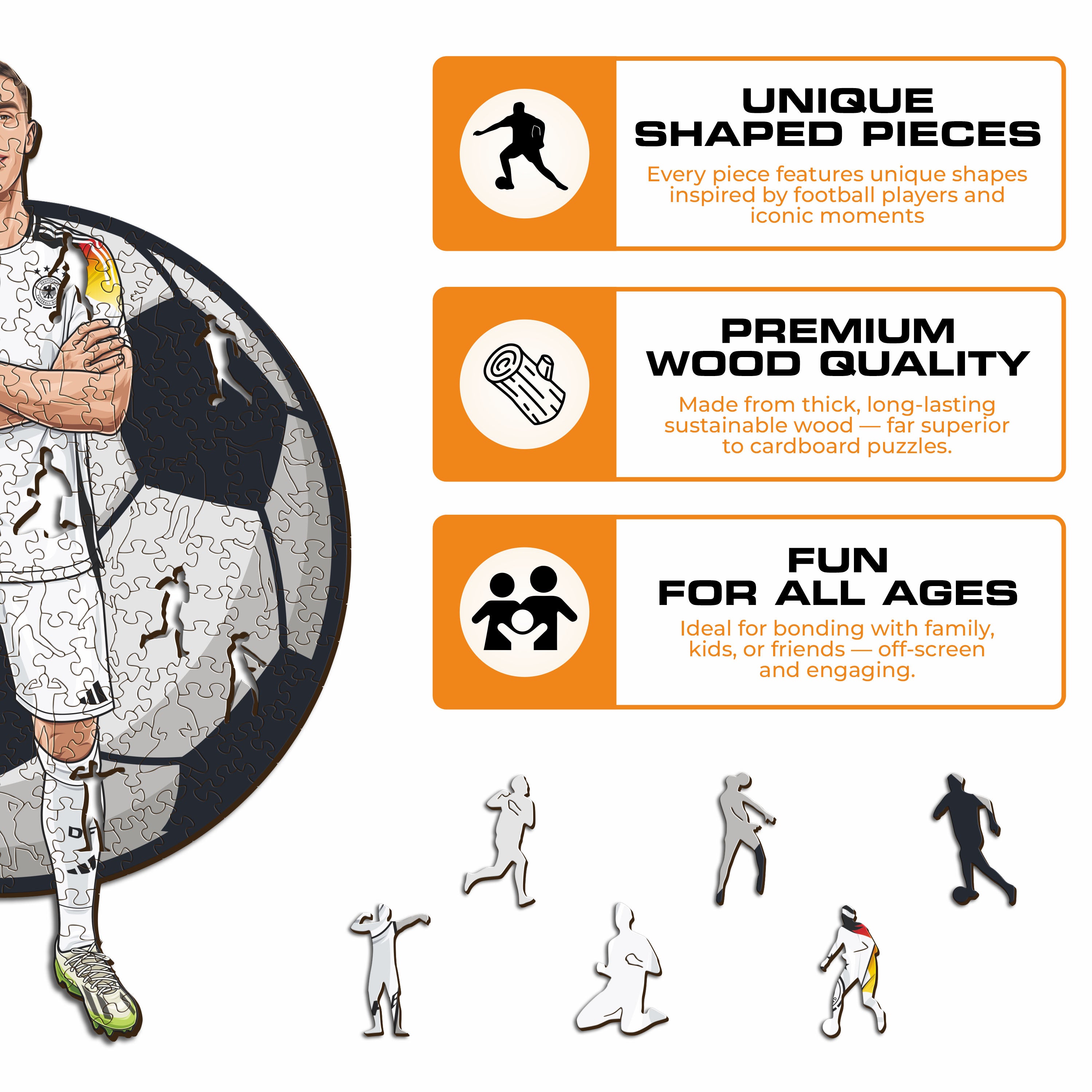 ✓ Each puzzle piece has a unique shape that depicts elements related to soccer and iconic player poses.