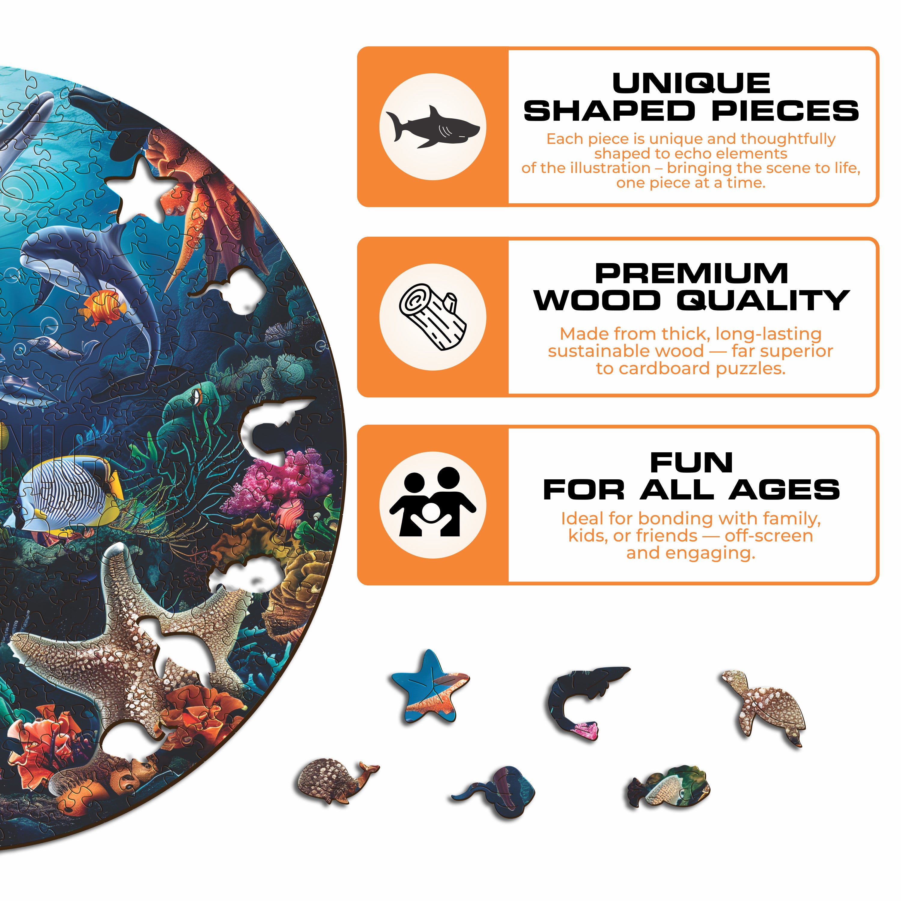 - 100% sustainable wooden puzzle 1/5in (0.3cm) thick.