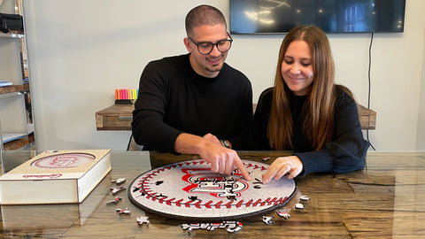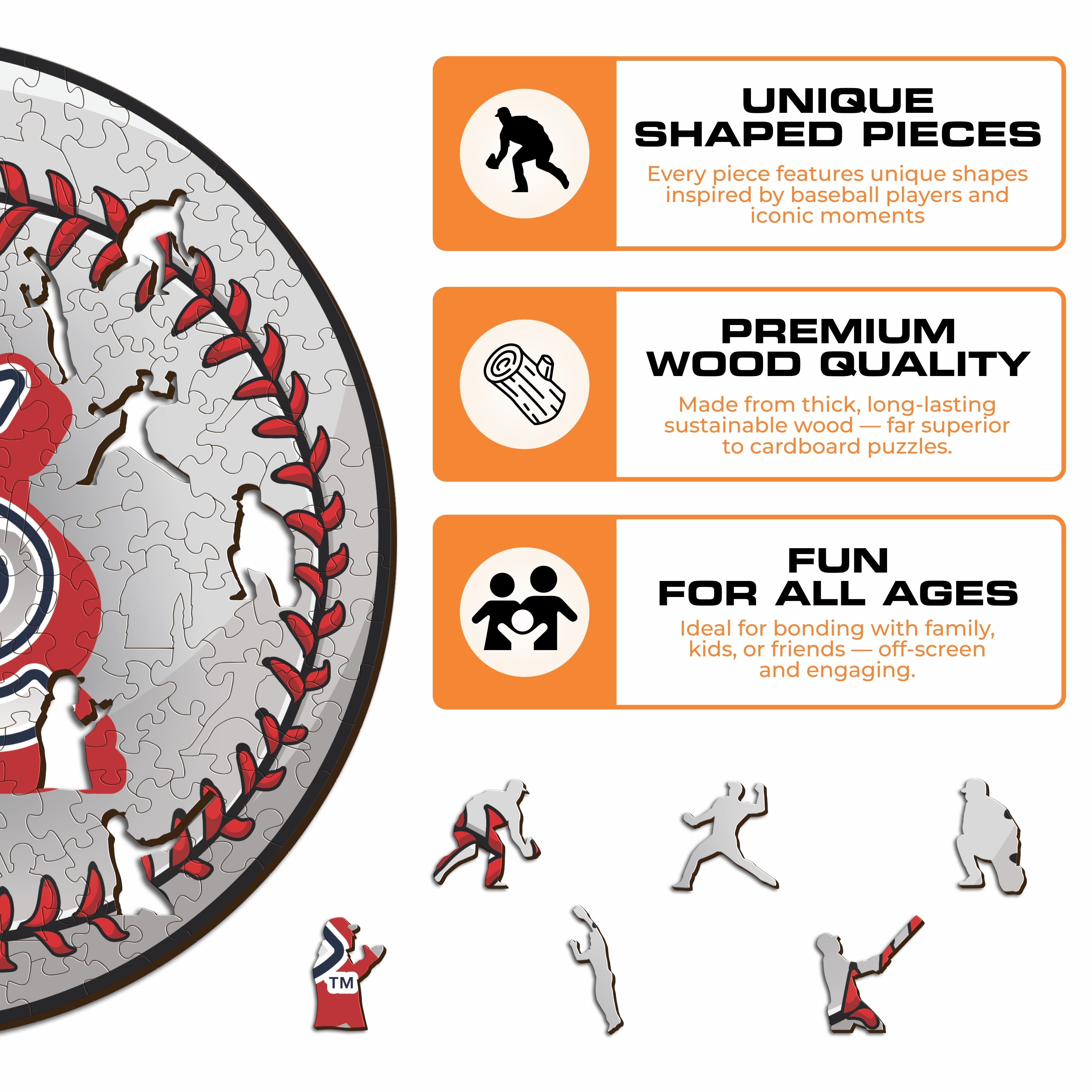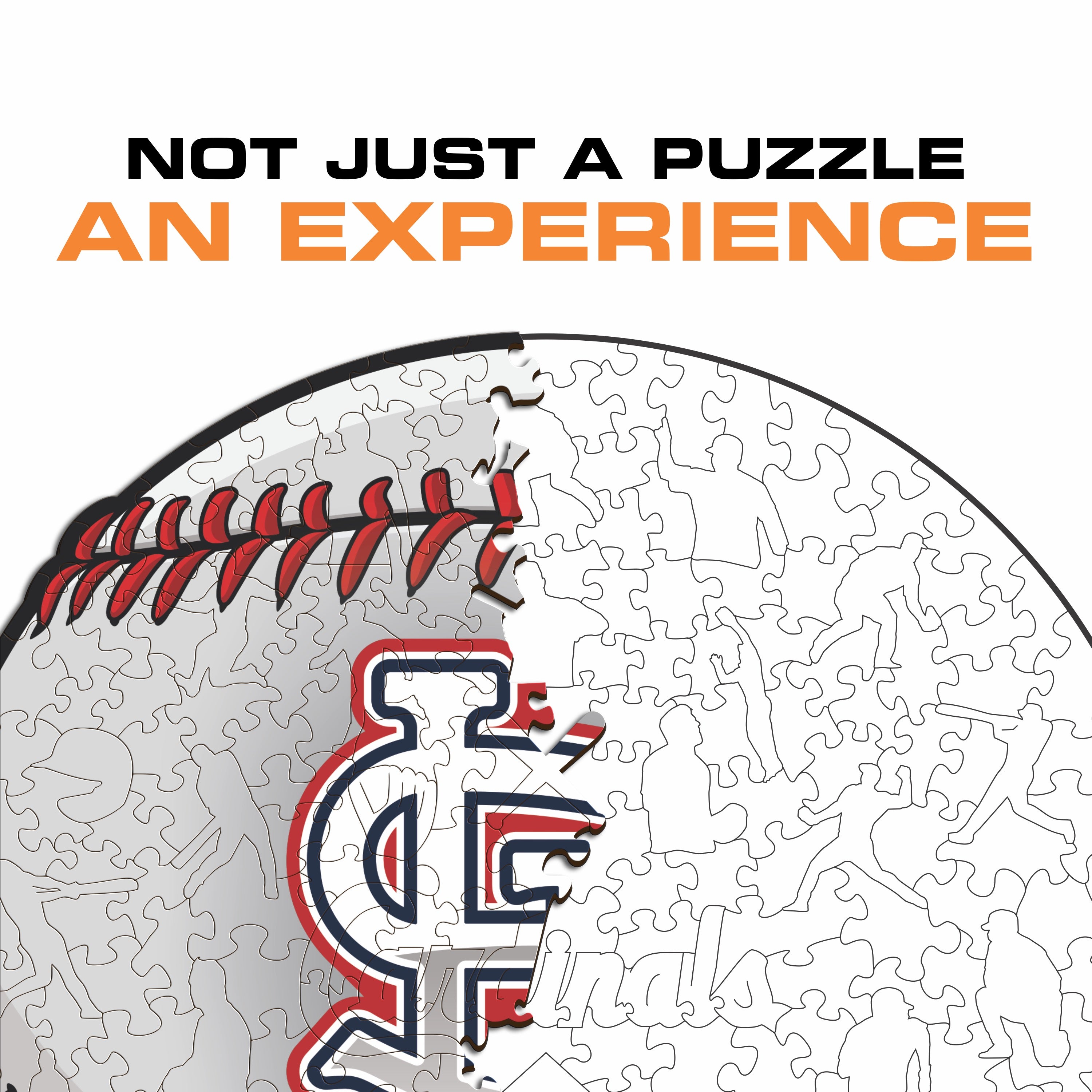 Each puzzle piece has a unique shape that depicts elements related to baseball and iconic player poses.