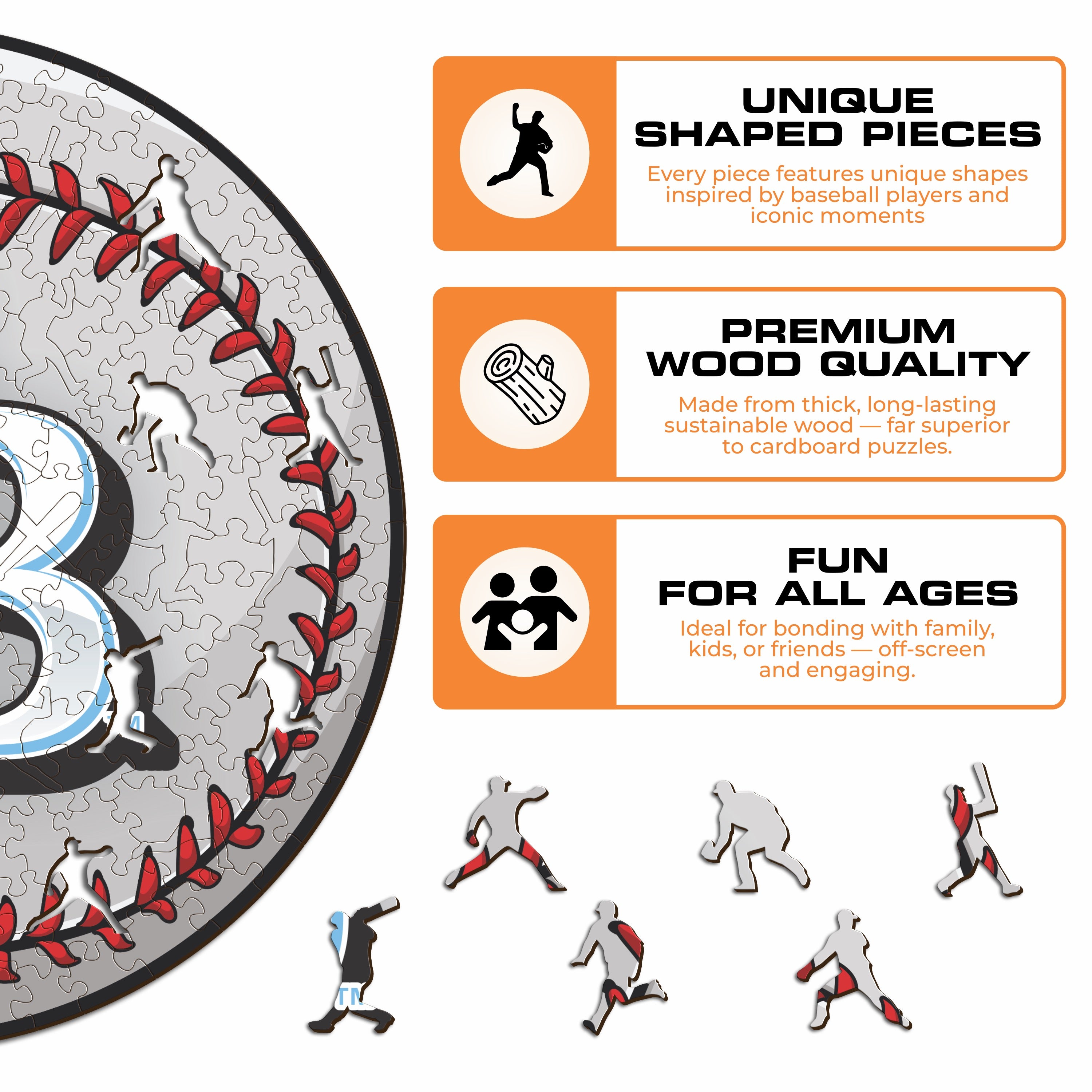 ✓ Each puzzle piece has a unique shape that depicts elements related to baseball and iconic player poses.