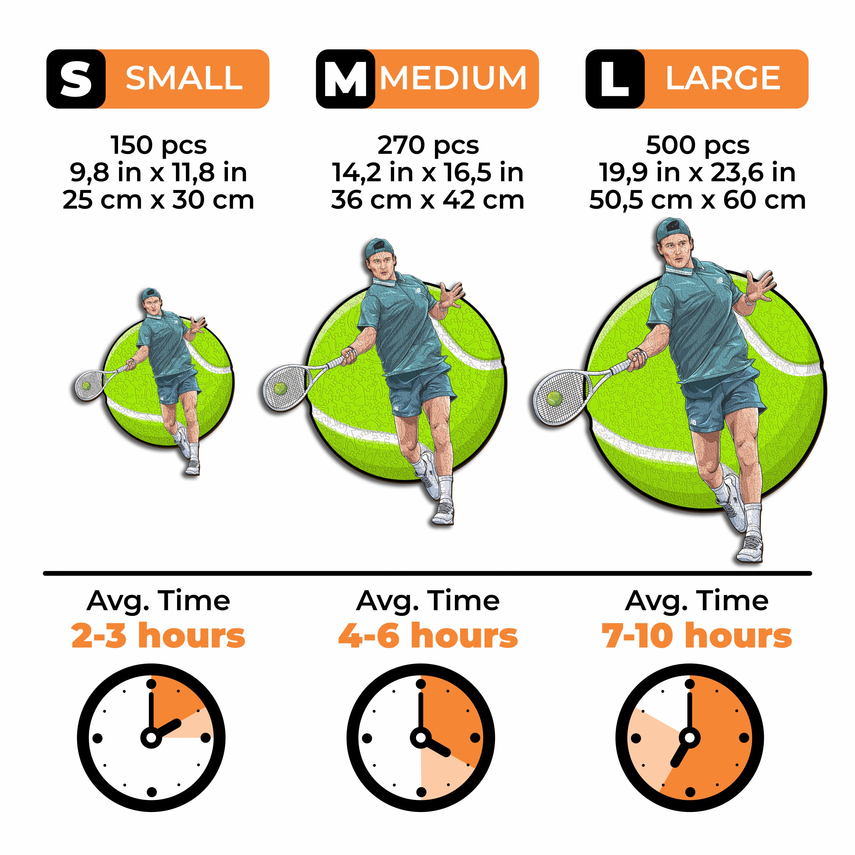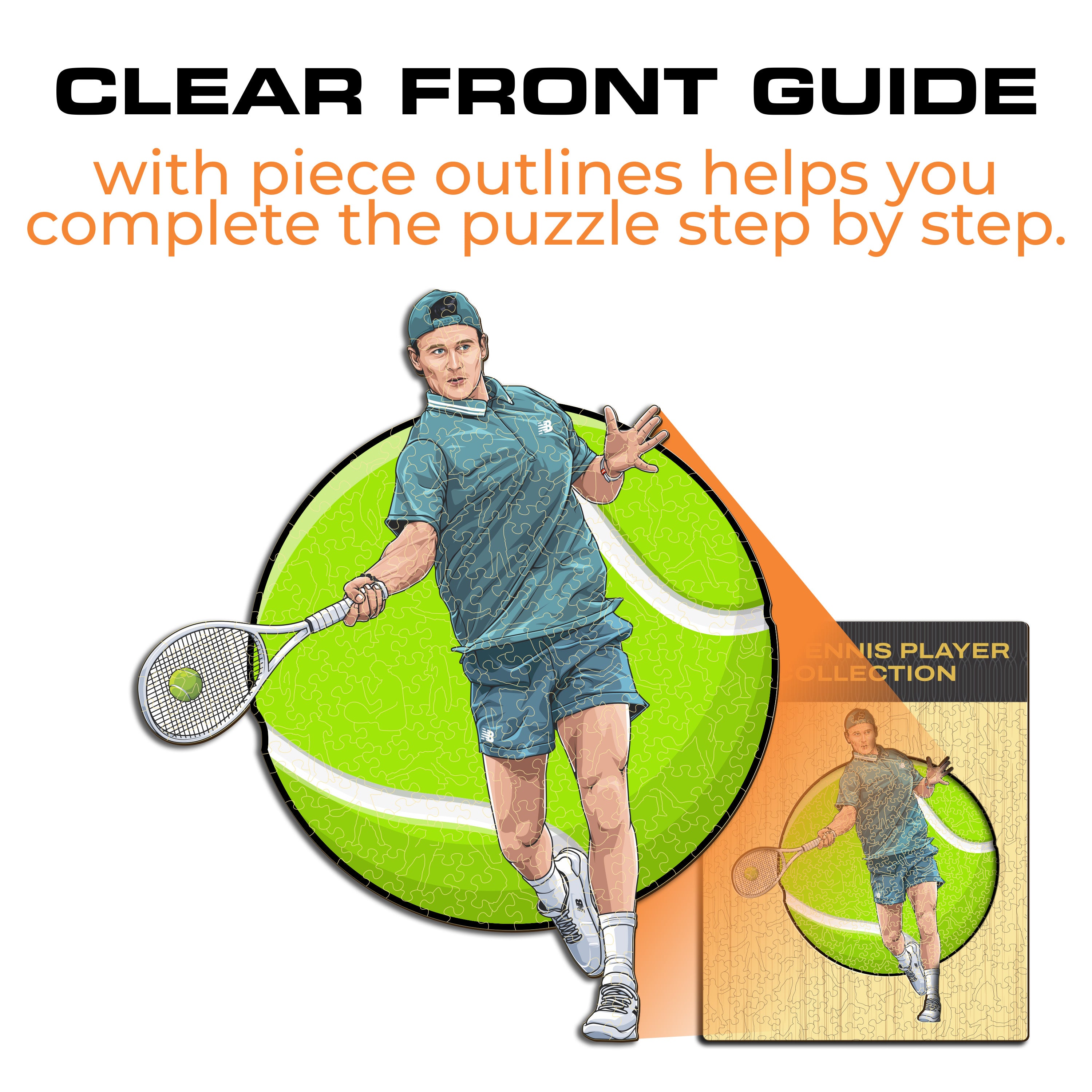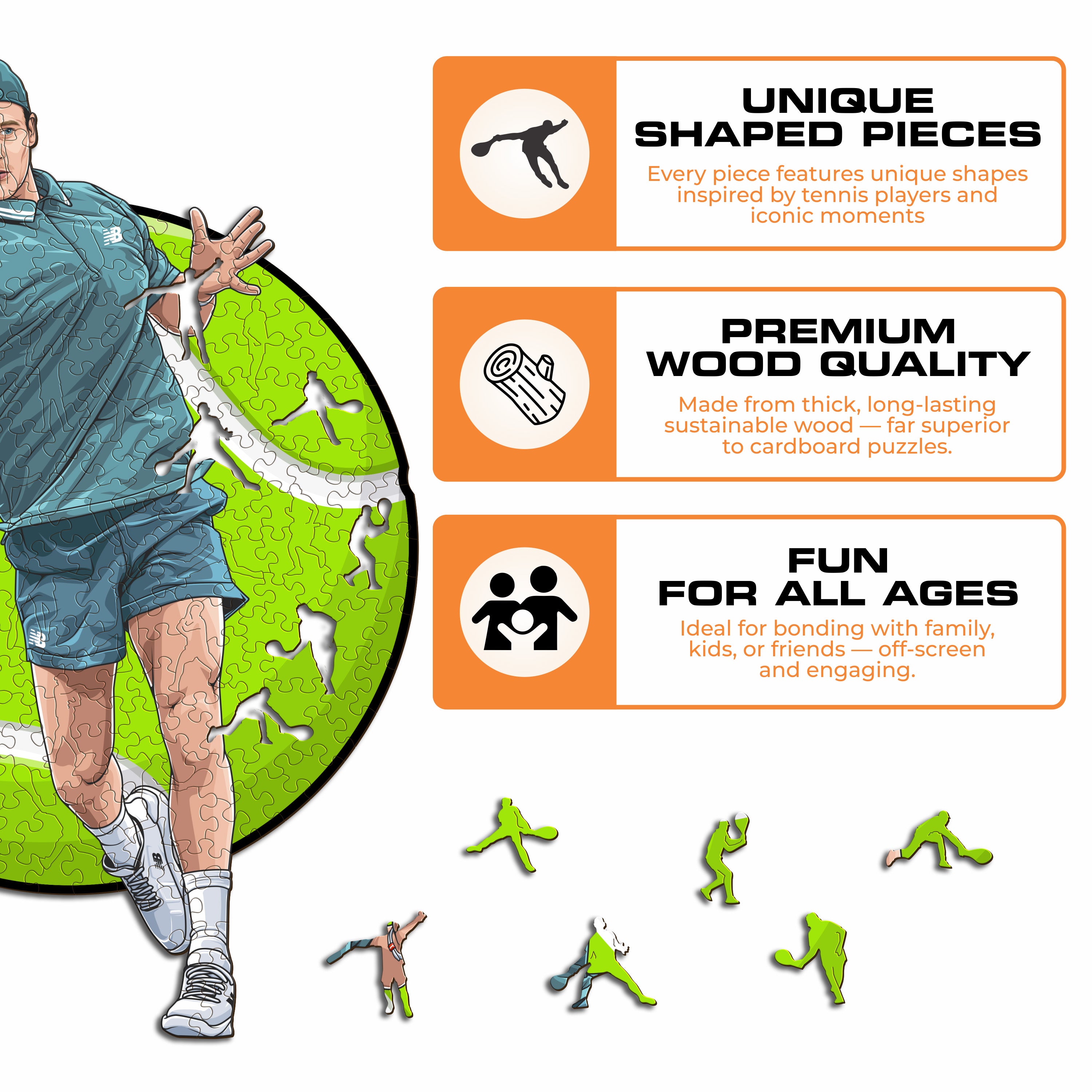 ✓ Each puzzle piece has a unique shape that depicts elements related to tennis and iconic player poses.