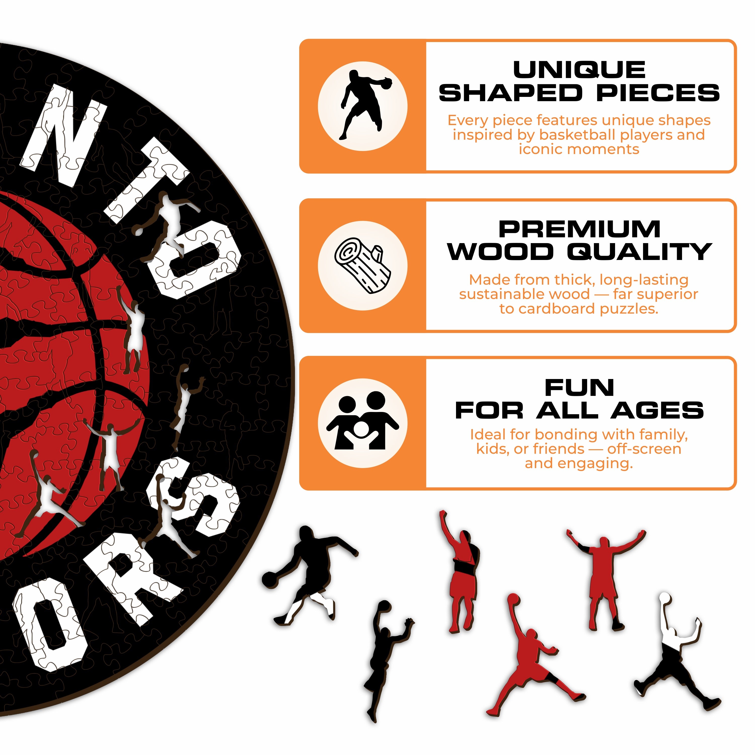 ✓ Each puzzle piece has a unique shape that depicts elements related to basketball and iconic player poses.