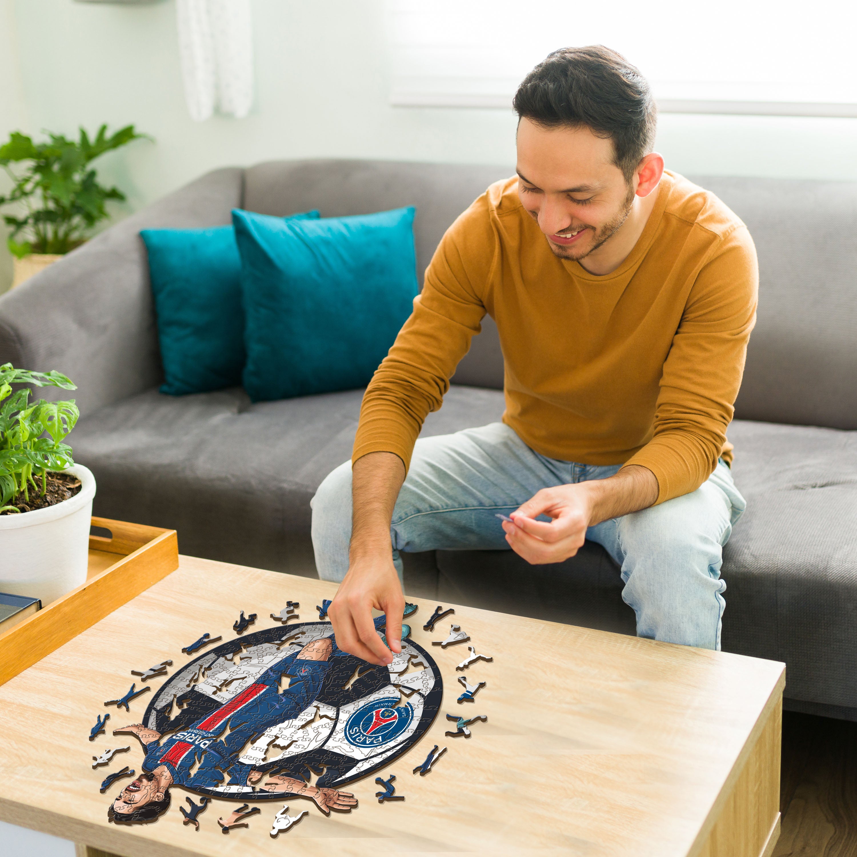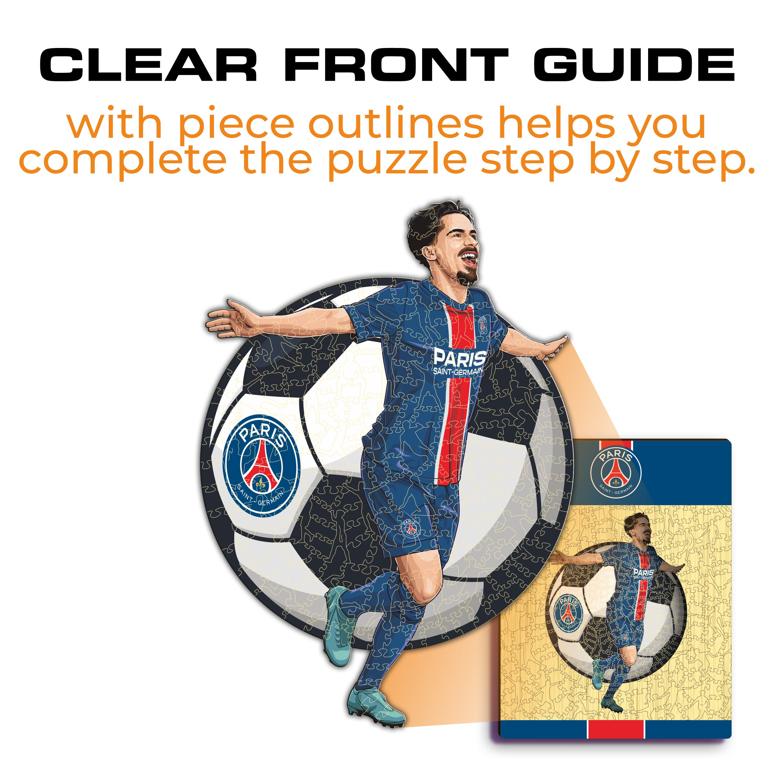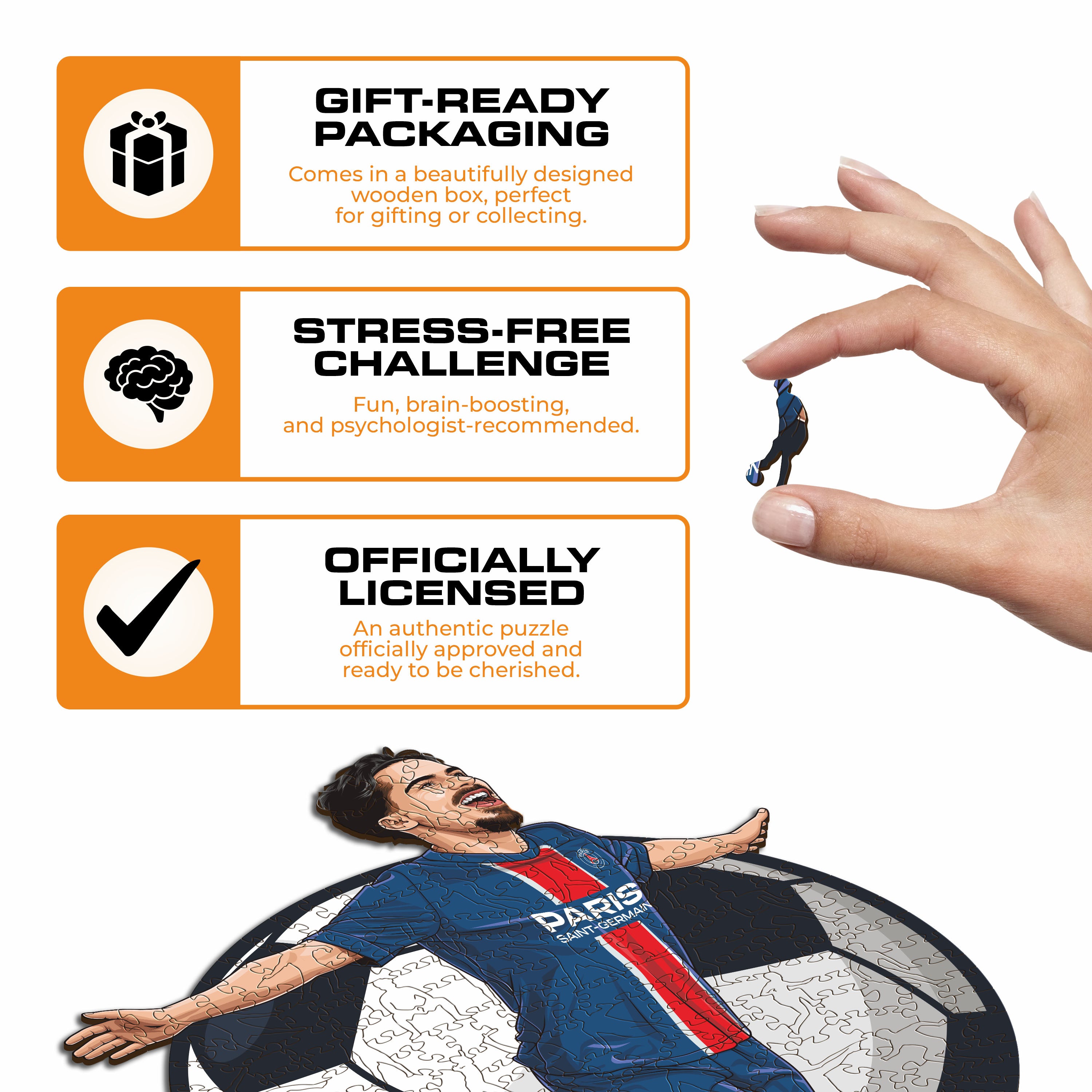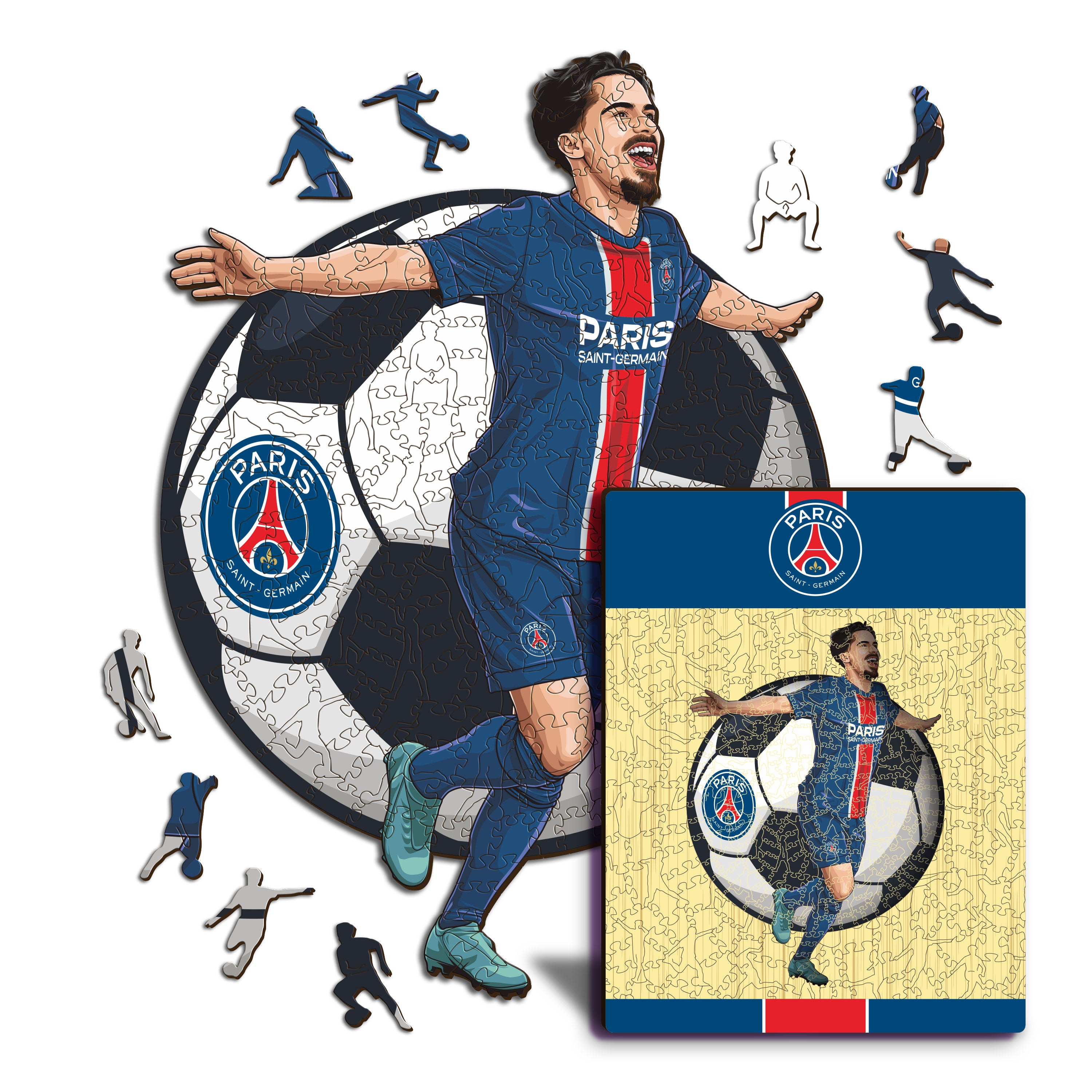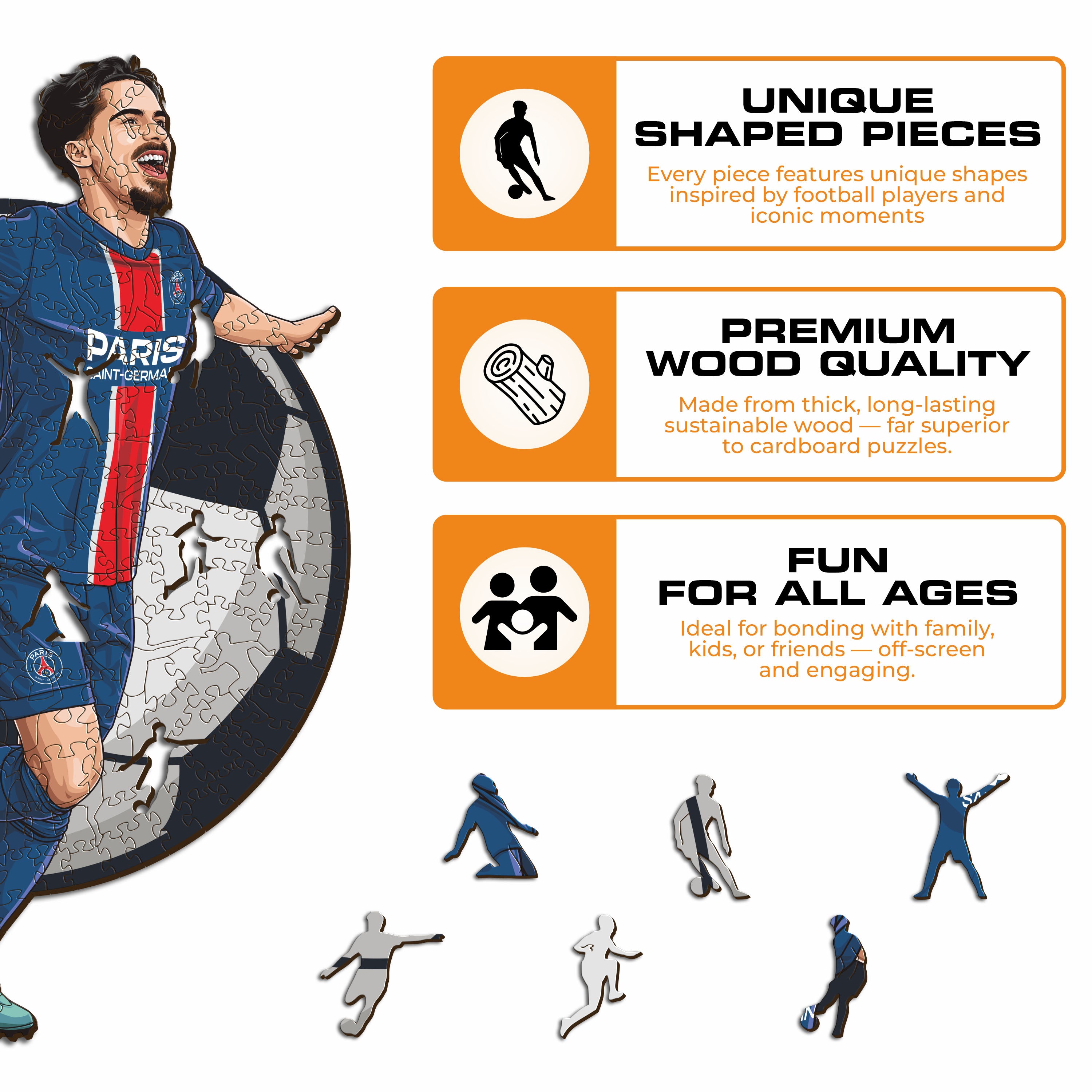 ✓ Each puzzle piece has a unique shape that depicts elements related to soccer and iconic player poses.