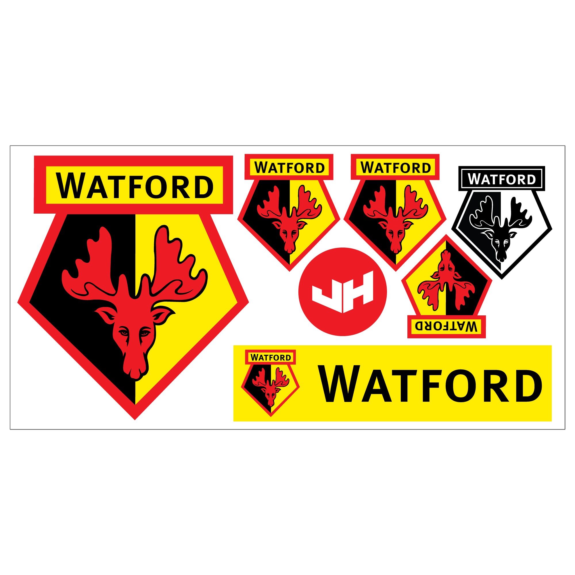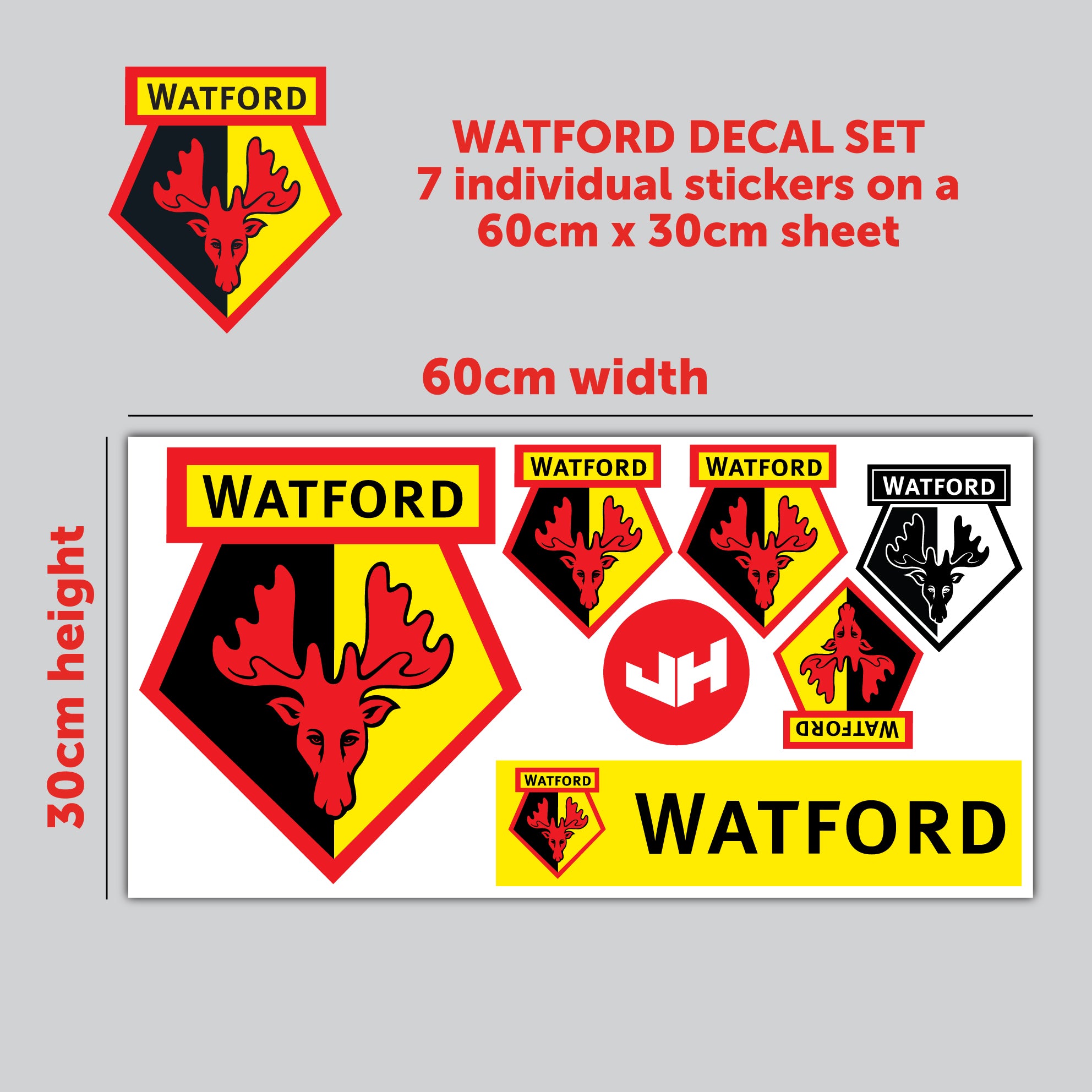 Contents: x1 Official Watford Football Club Decal Sticker Set. Includes 7 individual stickers on a 60cm x 30cm sheet.